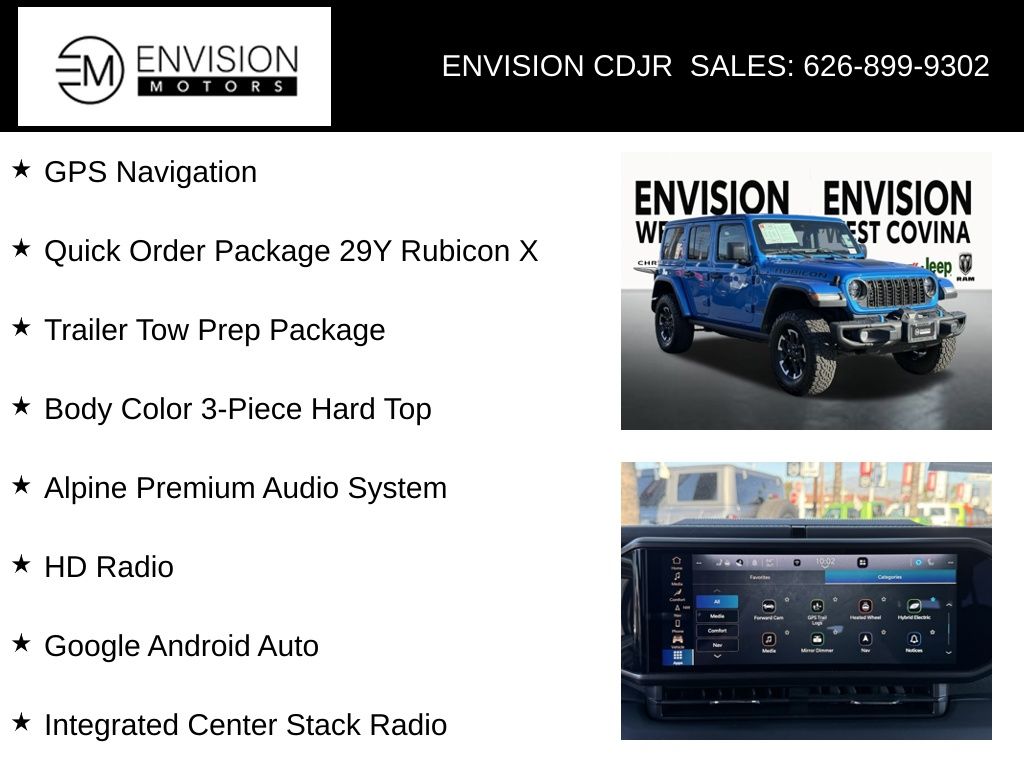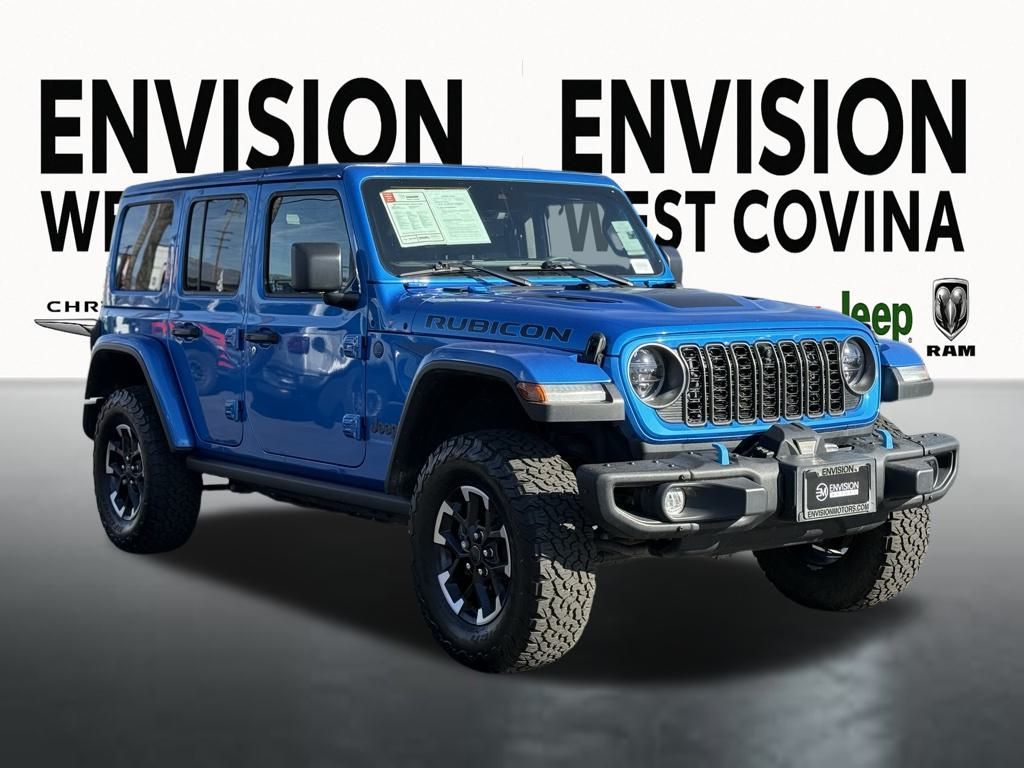 WE SPECIALIZE IN ALL CREDIT PROFILES! See what we can do for you! Call to find out (626) 899-9302.Certified. CARFAX One-Owner.2.0L I4 DOHC, 12.3" Touchscreen Display, 4G LTE Wi-Fi Hot Spot, 7 & 4 Pin Wiring Harness, 700 Amp Maintenance Free Battery, Acoustic Front Seat Area Carpet, Acoustic Laminated Front Door Glass, Alpine Premium Audio System, Apple CarPlay, Auto High Beam Headlamp Control, Auto-Dimming Rear-View Mirror, Blind Spot & Cross Path Detection, Body Color 3-Piece Hard Top, Body Color Rubicon Highline Flare, Connected Travel & Traffic Services, Connectivity - US/Canada, Disassociated Touchscreen Display, Freedom Panel Storage Bag, Google Android Auto, GPS Navigation, HD Radio, Heated Front Seats, Heated Steering Wheel, Integrated Center Stack Radio, Integrated Off-Road Camera, Integrated Voice Command w/Bluetooth, Leather Wrapped Park Brake Handle, Leather Wrapped Shift Knob, MOPAR Hardtop Headliner, Nappa Leather Seats, No Soft Top, ParkSense Rear Park Assist System, Performance Suspension, Power 4-Way Driver Lumbar Adjust, Power 4-Way Passenger Lumbar Adjust, Power Adjust 8-Way Driver Seat, Power Adjust 8-Way Front Passenger Seat, Premium Door Trim Panel, Quick Order Package 29Y Rubicon X, Radio: Uconnect 5 Nav w/12.3" Display, Rear Window Defroster, Rear Window Wiper/Washer, Remote Start System, SiriusXM Radio Service, SiriusXM w/360L, Steel Front Bumper, Steel Rear Bumper, Trailer Tow Prep Package, Universal Garage Door Opener, Wheels: 17" x 7.5" Machined w/Black Pockets.Hydro Blue Pearl Coat2024 Jeep Wrangler Rubicon X 4xe 4WD 8-Speed Automatic 2.0L I4 DOHCFCA US LLC Certified Pre-Owned Details: * Roadside Assistance * 125 Point Inspection * Transferable Warranty * Vehicle History * Vehicles Up to 75,000 Miles and/or 5 Model Years. 24-Hour Towing & Roadside Assistance, Car Rental Allowance, CARFAX® Vehicle History ReportTM and an Introductory 3-month Subscription to SiriusXM® Satellite Radio & Certified Warranty Upgrades * Powertrain Limited Warranty: 84 Month/100,000 Mile (whichever comes first) from original in-service date * Limited Warranty: 3 Month/3,000 Mile (whichever comes first) after new car warranty expires or from certified purchase date * Warranty Deductible: $100**********All Pricing and Advertised Prices for any/all vehicles offered for sale does not include dealer installed accessories which can be purchased for an additional cost.********** The Factory Rebates may not be available on this vehicle if you elect to take advantage of a Special Alternative APR or Special Lease program. Some Factory Rebates are California Resident specific and may vary for residents of other states. NO sales to Dealers, Brokers or Exporters. For out of state purchase, customers must be present to purchase. If shipping is required, dealership must facilitate; no exceptions. Please contact us for special Multi-Vehicle or Fleet pricing. Prices are plus government fees and taxes, any finance charges, $85 documentary fee, $29 electronic registration fee, any emission testing charge and $1.75 per new tire state tire fee. *** We make every effort to provide accurate information, but please verify before purchasing. Leasing & financing available on approved credit. Trade-ins accepted. Subject to prior sale.