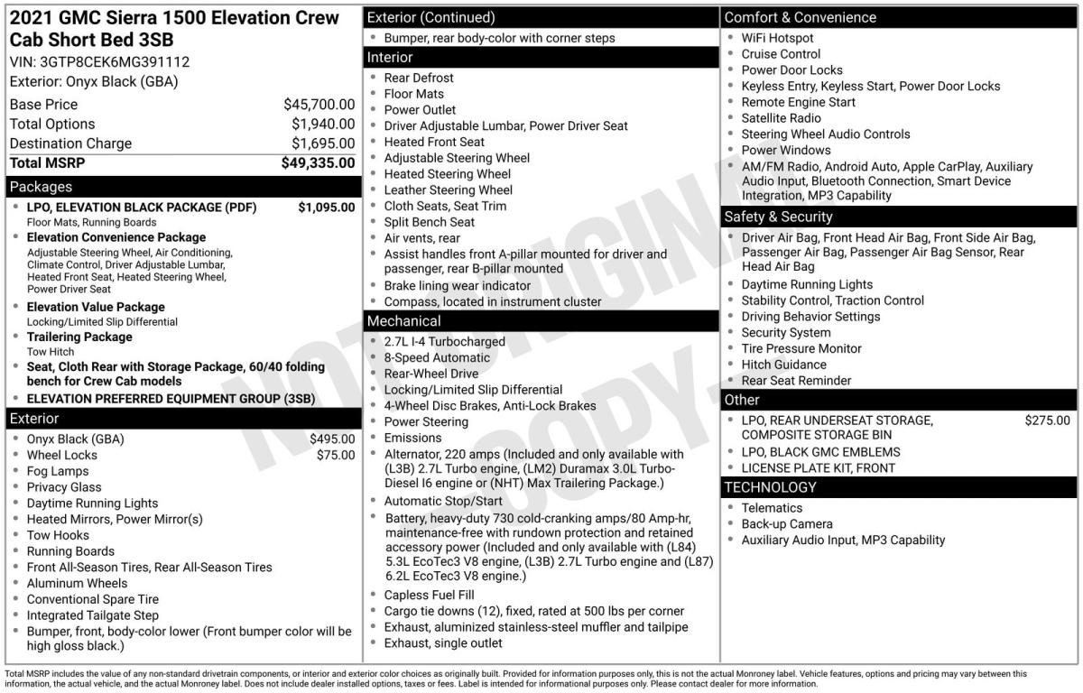 Onyx Black 2021 GMC Sierra 1500 Elevation RWD 8-Speed Automatic 2.7L Turbo 8-Speed Automatic, Black Cloth, 12-Volt Rear Auxiliary Power Outlet, 4G LTE Wi-Fi Hotspot Capable, 6" Rectangular Black Tubular Assist Steps (LPO), All-Weather Floor Liner (LPO), Auto-Locking Rear Differential, Black GMC Emblems (LPO), Body-Color Surround Grille, Cloth Rear Seat w/Storage Package, Color-Keyed Carpeting Floor Covering, Compass, Deep-Tinted Glass, Dual-Zone Automatic Climate Control, Electric Rear-Window Defogger, Electrical Lock Control Steering Column, Elevation Black Package (LPO), Elevation Convenience Package, Elevation Value Package, Front Frame-Mounted Black Recovery Hooks, Front Rubberized-Vinyl Floor Mats, GMC Connected Access Capable, Heated Steering Wheel, Hitch Guidance, Keyless Open & Start, LED Cargo Area Lighting, Manual Tilt-Wheel & Telescoping Steering Column, OnStar & GMC Connected Services Capable, Power Door Locks, Power Front Windows w/Driver Express Up/Down, Power Front Windows w/Passenger Express Down, Power Rear Windows w/Express Down, Preferred Equipment Group 3SB, Rear Dual USB Charging-Only Ports, Rear Rubberized-Vinyl Floor Mats, Rear Wheelhouse Liners, Remote Vehicle Starter System, Steering Wheel Audio Controls, Theft Deterrent System (Unauthorized Entry), Trailering Package.Recent Arrival! Odometer is 3196 miles below market average!