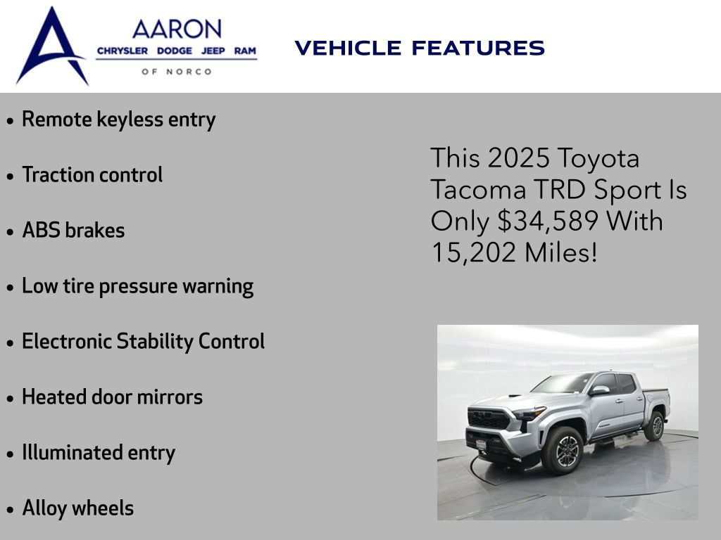 2025 Toyota Tacoma TRD Sport with Predator Drop Step, All-Weather Floor Liners, and Black Badge Overlay. Just over 15,000 miles, TRD Sport styling, 1-Owner, regular oil changes, and 21/26 MPG.This Tacoma TRD Sport delivers standout capability with its 2.4L turbocharged i-FORCE engine, smooth 8-speed automatic transmission, and rear-wheel drive. The Predator drop step and all-weather floor liners add convenience and durability, while the Black Badge Overlay sharpens its exterior profile. Para la version en espanol, vea abajo.Inside, the Double Cab offers smart storage, a touchscreen interface, full LED lighting, versatile seating, and advanced safety tech like Blind Spot Monitor and Rear Cross-Traffic Alert. A power driver seat, multiple USB ports, wireless phone connectivity, cargo bed tie-downs, and composite bed design make it ideal for daily driving, weekend gear, or contractor use.Its flexible cabin layout, strong turbo torque, Trailer Wiring Harness, and multi-link rear suspension support confident hauling and smooth road performance. Driver-assist features such as Dynamic Radar Cruise Control and Lane Departure Alert enhance confidence while commuting or traveling.Renowned for its reliability and long-term durability, the Tacoma continues to be one of the most trusted midsize trucks in its segment.Our dealership focuses on a transparent process supported by thorough inspections, simple financing options, and a customer-first approach. We provide expert guidance, answer questions clearly, and work hard to create a no-pressure, confidence-building experience from start to finish.If this catches your eye, reach out now for more photos, a detailed walk-around video, or to book an in-dealership appointment. We're committed to making the process smooth, with expert advice on trade-ins and competitive offers to ease any worries.2025 Toyota Tacoma TRD Sport con Predator Drop Step, tapetes para todo clima y Black Badge Overlay. Poco mas de 15,000 millas, estilo TRD Sport, 1-Owner y cambios de aceite regulares.Esta Tacoma TRD Sport combina capacidad y estilo con su motor i-FORCE turbo de 2.4L, transmision automatica de 8 velocidades y traccion trasera. El Predator drop step y los tapetes para todo clima aumentan la utilidad, mientras el Black Badge Overlay realza su presencia.Por dentro, la cabina Double Cab ofrece almacenamiento inteligente, pantalla tactil, iluminacion LED, asientos versatiles y tecnologias avanzadas como monitoreo de punto ciego y alerta de cruce trasero. El asiento electrico del conductor, varios puertos USB, conectividad inalambrica y la cama compuesta con amarres la hacen ideal para uso diario o de trabajo.Su cabina funcional, el torque del motor turbo, el arnes de trailer y la suspension trasera multibrazo brindan un manejo estable y capacidad para transportar equipo con confianza. Asistencias como control crucero dinamico y alerta de salida de carril aumentan la seguridad al viajar.Reconocida por su confiabilidad y durabilidad, la Tacoma sigue siendo una de las camionetas medianas mas valoradas del mercado.Nos enfocamos en un proceso transparente con inspecciones completas, financiamiento sencillo y un ambiente sin presion. Nuestro equipo esta listo para ayudarte, aclarar dudas y asegurar que tu experiencia sea positiva.Da el siguiente paso enviandonos un mensaje para una cotizacion personalizada o para agendar una visita conveniente. Ofrecemos opciones flexibles y resolvemos tus dudas con total claridad para que compres con confianza.