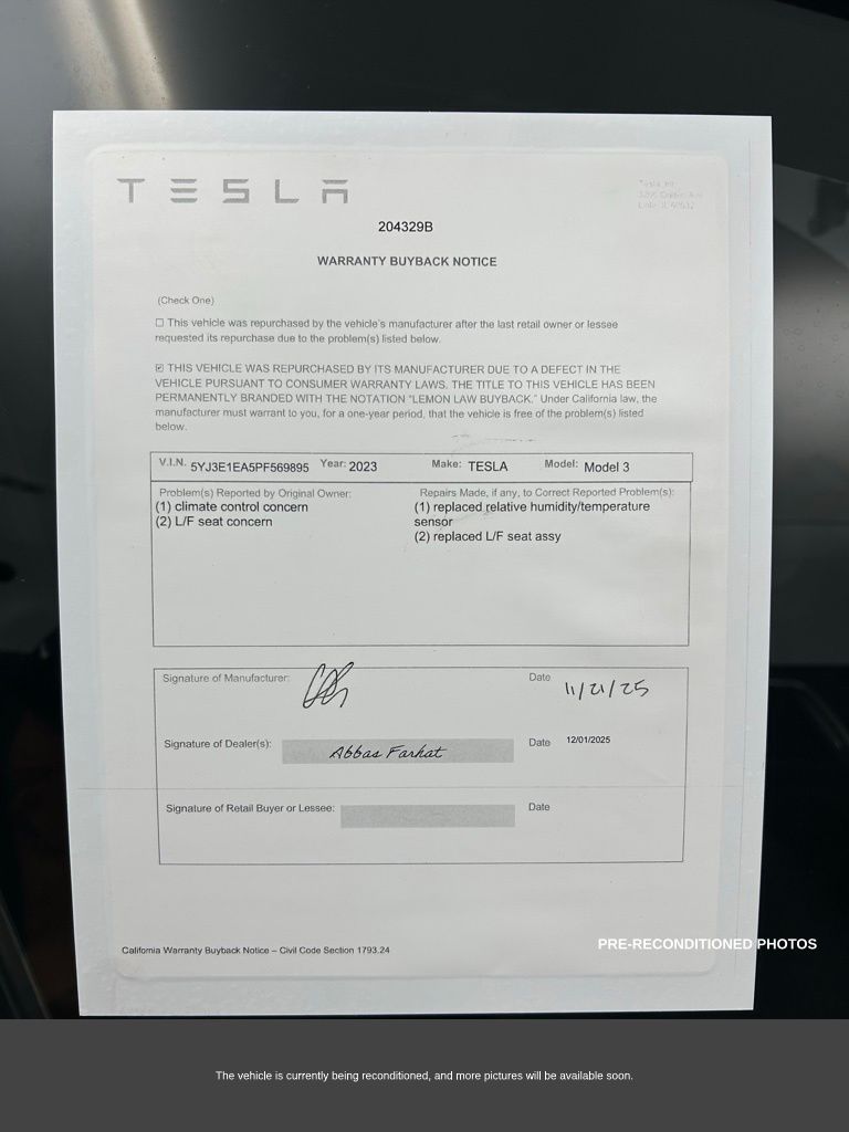 BUYBACK! NO HIDDEN FEES! ALL RECONDITIONING COSTS ARE FULLY INCLUDED IN OUR PRICES. RE-PURCHASED BY THE MANUFACTURER! DISCOUNTED PRICE: MOST VEHICLES COME WITH A 12-MONTH MANUFACTURER WARRANTY! SEE BELOW FOR ADDITIONAL DETAILS.THE MANUFACTURER REPURCHASED THIS VEHICLE DUE TO A COMPLAINT FROM THE ORIGINAL OWNER. DESPITE HAVING RESOLVED THE ISSUE, THIS VEHICLE IS KNOWN AS A MANUFACTURER BUYBACK. ALL MANUFACTURER WARRANTIES REMAIN INTACT AND EXTENDED WARRANTIES ARE AVAILABLE2023 Tesla Model 3 Rear-Wheel Drive with standout efficiency, RWD traction, and CARFAX 1-Owner plus no accidents reported. Rounded mileage is just under 35,000 miles.Pearl White Multi-Coat with Black interior and an electric motor delivering instant torque. EPA-rated 138/126 MPGe and packed with advanced features like a rear camera, side-collision warning, lane departure mitigation, touchscreen interface, navigation, and premium audio. Para la version en espanol, vea abajo.This Model 3 suits commuters and tech-focused drivers seeking exceptional efficiency, intuitive digital controls, fast charging capability, and a spacious cargo area. Its driver-assist suite, smartphone integration, and minimalist cabin design make it ideal for daily travel or long-distance EV driving.Renowned for its reliability and performance in the EV segment, consistently praised for safety and efficiency.Our transparent process, included recon costs, and dedication to customer satisfaction ensure a smooth buying experience. We provide expert guidance, stress-free financing options, and a no-pressure environment backed by a knowledgeable team ready to assist every step of the way.If this catches your eye, reach out now for more photos, a detailed walk-around video, or to book an in-dealership appointment. We're committed to making the process smooth, with expert advice on trade-ins and competitive offers to ease any worries.2023 Tesla Model 3 Rear-Wheel Drive con eficiencia destacada, traccion RWD y CARFAX de 1 dueno sin accidentes reportados. El kilometraje redondeado es apenas debajo de 35,000 millas.Acabado Pearl White Multi-Coat con interior negro y motor electrico de respuesta inmediata. Clasificacion EPA de 138/126 MPGe y equipado con camara trasera, advertencia de colision lateral, mitigacion de salida de carril, pantalla tactil, navegacion y audio premium.Este Model 3 es ideal para quienes buscan eficiencia diaria, controles digitales intuitivos, capacidad de carga rapida y buen espacio para carga. Su paquete de asistencias al conductor, integracion con smartphone y cabina minimalista lo hacen perfecto para manejo diario o viajes largos en un EV.Reconocido por su confiabilidad y desempeno dentro del segmento electrico, con excelentes valoraciones en seguridad y eficiencia.Nuestro proceso transparente, costos de reacondicionamiento incluidos y compromiso con la satisfaccion del cliente aseguran una experiencia de compra sencilla. Ofrecemos asesoria experta, opciones de financiamiento sin presion y un equipo dedicado a ayudarte en cada paso.Da el siguiente paso enviandonos un mensaje para una cotizacion personalizada o para programar una visita conveniente. Ofrecemos opciones flexibles y responderemos cualquier pregunta con total transparencia para brindarte confianza.