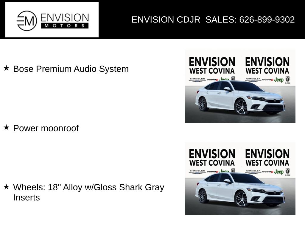 WE SPECIALIZE IN ALL CREDIT PROFILES! See what we can do for you! Call to find out (626) 899-9302.Recent Arrival! CARFAX One-Owner. Clean CARFAX.Odometer is 3908 miles below market average! 31/38 City/Highway MPG Black Leather, Bose Premium Audio System, Power moonroof, Wheels: 18" Alloy w/Gloss Shark Gray Inserts.Platinum White2024 Honda Civic Touring FWD CVT 1.5L I4 DOHC 16V**********All Pricing and Advertised Prices for any/all vehicles offered for sale does not include dealer installed accessories which can be purchased for an additional cost.********** The Factory Rebates may not be available on this vehicle if you elect to take advantage of a Special Alternative APR or Special Lease program. Some Factory Rebates are California Resident specific and may vary for residents of other states. NO sales to Dealers, Brokers or Exporters. For out of state purchase, customers must be present to purchase. If shipping is required, dealership must facilitate; no exceptions. Please contact us for special Multi-Vehicle or Fleet pricing. Prices are plus government fees and taxes, any finance charges, $85 documentary fee, $29 electronic registration fee, any emission testing charge and $1.75 per new tire state tire fee. *** We make every effort to provide accurate information, but please verify before purchasing. Leasing & financing available on approved credit. Trade-ins accepted. Subject to prior sale.