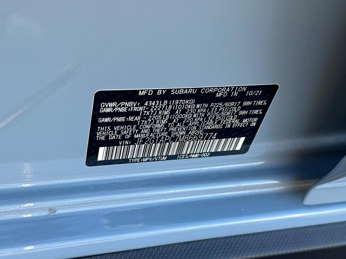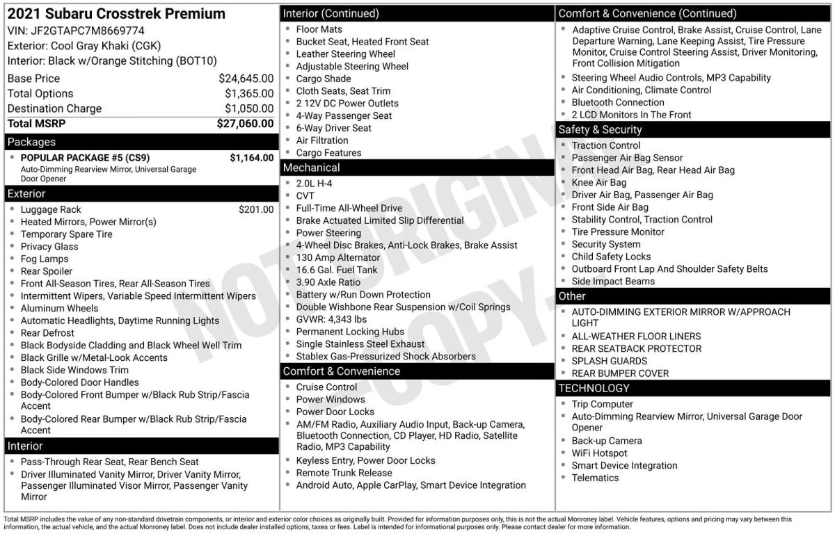Cool Gray Khaki 2021 Subaru Crosstrek Premium AWD Lineartronic CVT 2.0L DOHC 17" Alloy Wheels, Aero Crossbar Set, All-Weather Floor Liners, Alloy wheels, Auto-Dimming Exterior Mirror w/Approach Light, Auto-Dimming Mirror w/Compass & HomeLink, Cloth Upholstery, EyeSight System, Front fog lights, Fully automatic headlights, Heated Front Bucket Seats, Heated front seats, High Grade Combination Meter w/Color LCD Display, Illuminated Storage Tray in Front Center Console, Leather-Wrapped Shift Lever Handle, Overhead Console Shower Light, Panic alarm, Popular Package #5, Rear Bumper Cover, Rear Seat Reminder, Rear Seatback Protector, Security system, Splash Guards, Standard Model (CVT), Tire Pressure Monitoring System.Odometer is 15755 miles below market average! 28/33 City/Highway MPGAwards: * ALG Residual Value Awards, Residual Value Awards