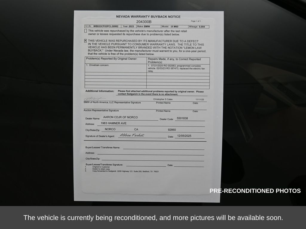 THIS IS A LEMON LOW BUYBACK VEHICLE. PLEASE ADD THE DESCRIPTION NOTE BELOW.BUYBACK! NO HIDDEN FEES! ALL RECONDITIONING COSTS ARE FULLY INCLUDED IN OUR PRICES. RE-PURCHASED BY THE MANUFACTURER! DISCOUNTED PRICE: MOST VEHICLES COME WITH A 12-MONTH MANUFACTURER WARRANTY! SEE BELOW FOR ADDITIONAL DETAILS.THE MANUFACTURER REPURCHASED THIS VEHICLE DUE TO A COMPLAINT FROM THE ORIGINAL OWNER. DESPITE HAVING RESOLVED THE ISSUE, THIS VEHICLE IS KNOWN AS A MANUFACTURER BUYBACK. ALL MANUFACTURER WARRANTIES REMAIN INTACT AND EXTENDED WARRANTIES ARE AVAILABLE.2023 BMW iX M60 with Wheels 22", Aventurin Red metallic, Castanea Chestnut full leather, Executive Package, and bronze exterior trim. AWD dual-motor performance plus no accidents reported to CARFAX and strong service history make it stand out.This luxury EV shows just over 11,000 miles and delivers elite electric performance with advanced driver-assist, premium comfort, and top-tier safety technology. Para la version en espanol, vea abajo.The Executive Package enhances everyday usability with upgraded tech, comfort features, and visibility systems, while the full leather interior and panoramic sky roof elevate cabin ambiance. Ideal for drivers seeking cutting-edge EV capability, all-wheel traction, and high-end BMW craftsmanship for commuting or long-range travel.This model year earned the IIHS Top Safety Pick+ award for its exceptional safety performance.We provide a transparent process, thorough reconditioning, easy financing options, and market-based guidance to ensure confidence in every purchase. Our expert team is committed to answering questions, offering a no-pressure environment, and delivering a smooth, rewarding experience from start to finish.Ready to see this vehicle up close? Contact us today to schedule a no-obligation test drive or virtual tour, and let's discuss how we can tailor financing to fit your needs. Our team is dedicated to addressing any concerns and guiding you every step of the way.2023 BMW iX M60 con rines de 22", pintura Aventurin Red, asientos de piel Castanea Chestnut, Executive Package y detalles exteriores en bronce. Su desempeno AWD de doble motor, historial sin accidentes en CARFAX y buen mantenimiento lo hacen destacar.Este vehiculo electrico de lujo muestra poco mas de 11,000 millas y ofrece rendimiento avanzado, tecnologia de asistencia al conductor y seguridad de primer nivel.El Executive Package mejora la experiencia diaria con tecnologia avanzada y mayor comodidad, mientras que el interior de piel y el techo panoramico crean una cabina premium. Ideal para quienes buscan una SUV electrica de alto nivel con traccion integral y gran comodidad para viajes largos.Este ano modelo obtuvo el premio IIHS Top Safety Pick+ por su excelente nivel de seguridad.Ofrecemos un proceso transparente, reacondicionamiento completo, opciones de financiamiento sencillas y asesoria basada en datos. Nuestro equipo esta listo para resolver dudas, sin presion, y brindar una experiencia confiable y satisfactoria.Listo para dar el siguiente paso? Envianos un mensaje para una cotizacion personalizada o para programar una visita conveniente. Ofrecemos opciones flexibles y responderemos tus preguntas con total transparencia.