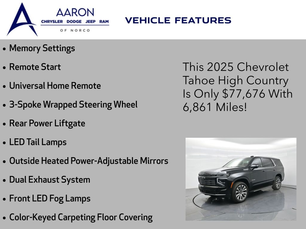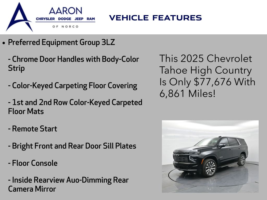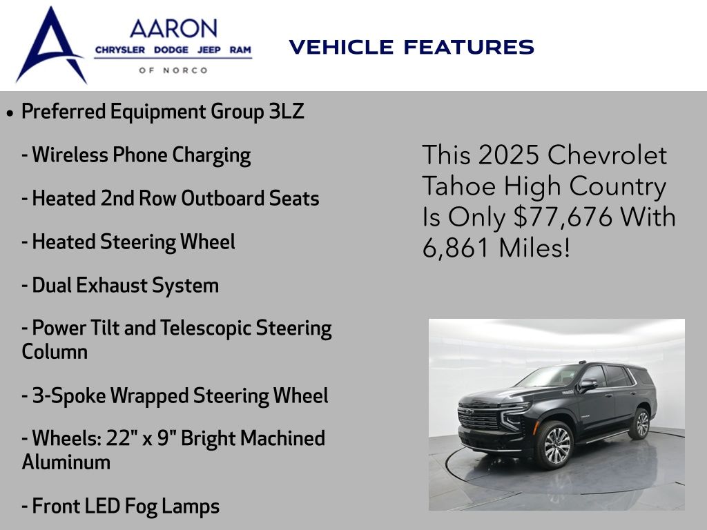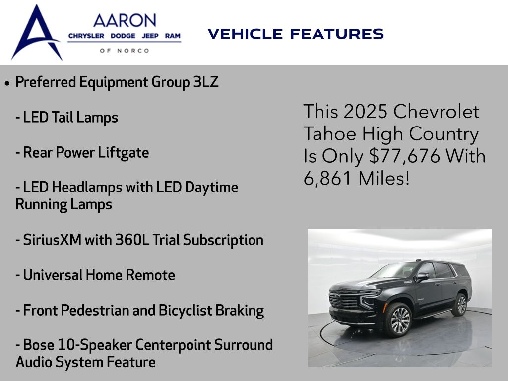 2025 Chevrolet Tahoe High Country. Black, 6.2L EcoTec3 V8 with 10-speed automatic, 4WD. CARFAX 1-Owner, no accidents reported. Just under 5,000 miles. 14 city/18 highway MPG.Equipped with Premium Luxury features including heated/ventilated front bucket seats, heated second-row outboard seats, power-folding third row, panoramic sunroof, and head-up display. Technology highlights include a 17" advanced color LCD display, Bose 10-speaker premium system, HD Surround Vision, and wireless Apple CarPlay/Android Auto. Added Premium Interior and Cargo Package includes premium floor liners and all-weather cargo mats.Performance is enhanced with Magnetic Ride Control, adaptive cruise, and trailer sway control. Safety suite includes enhanced automatic emergency braking, blind spot steering assist, rear cross traffic braking, pedestrian alerts, and IntelliBeam auto high beams. This full-size SUV blends refined luxury with unmatched utility.Renowned for its reliability and performance in its segment.We offer a transparent process, thorough reconditioning, and easy financing options. Our convenient locations make shopping simple. Expert staff are ready to answer questions in a no-pressure environment. We price with live market data to ensure fair deals and long-term satisfaction.Take the next step by messaging us for a personalized quote or to arrange a convenient visit. We offer flexible options like virtual consultations and promise to resolve any questions transparently to build your confidence in us.