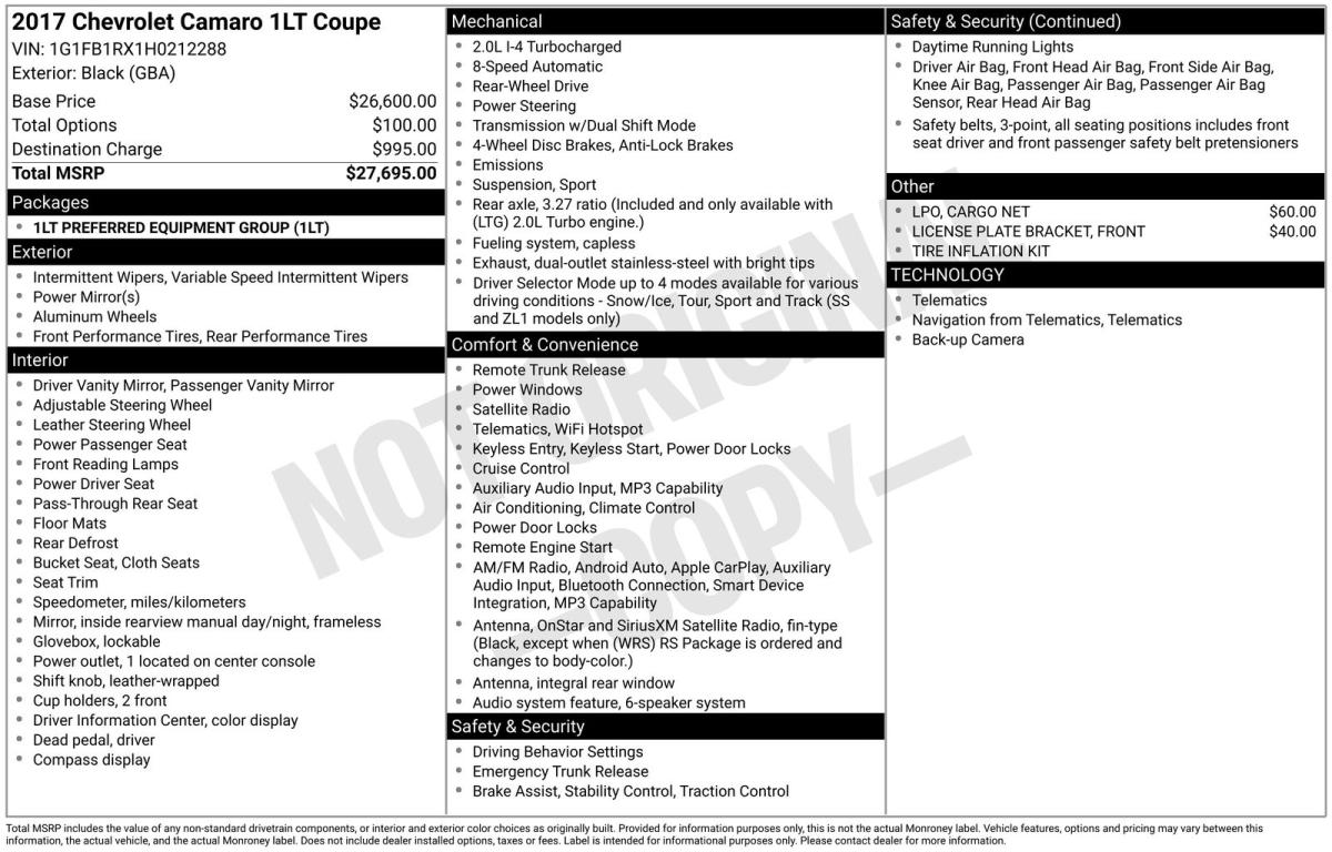 Black 2017 Chevrolet Camaro 1LT RWD 8-Speed Automatic 2.0L TurbochargedRecent Arrival! 22/31 City/Highway MPGAwards: * Car and Driver 10 Best Cars * 2017 KBB.com 10 Coolest Cars Under $25,000 * 2017 KBB.com 10 Most Awarded BrandsCar and Driver, January 2017.Reviews: * Surprisingly sharp and nimble handling around turns, with lots of grip; appealing lineup of engines, including a strong V6 and a powerful V8, that provide class-leading acceleration; smooth ride quality on the highway and in town; good value, with lots of standard equipment. Source: Edmunds