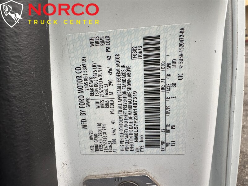 INSTALLED FEATURES: Air filtration, Front air conditioning, Front air conditioning zones: single, Airbag deactivation: occupant sensing passenger, Front airbags: dual, Side airbags: front, Side curtain airbags: front, Antenna type: diversity / mast, Auxiliary audio input: Bluetooth / iPod/iPhone / USB, Radio: AM/FM / touch screen display / voice operated, Satellite radio: SiriusXM, Speed sensitive volume control, Total speakers: 4, ABS: 4-wheel, Braking assist, Electronic brakeforce distribution, Emergency braking preparation, Front brake type: ventilated disc, Power brakes, Rear brake type: disc, Door trim: cloth, Floor mat material: carpet, Floor material: cargo area rubber/vinyl / carpet, Floor mats: front, Interior accents: chrome, Shift knob trim: urethane, Steering wheel trim: urethane, Assist handle: front, Capless fuel filler system, Cargo area light, Center console: front console with armrest and storage, Cruise control, Cupholders: 2 / front, Multi-function remote: keyless entry / panic alarm / trunk release, One-touch windows: 1, Overhead console: front, Power outlet(s): 12V cargo area / 12V front, Power steering, Reading lights: front, Steering wheel: tilt and telescopic, Steering wheel mounted controls: cruise control / voice control, Storage: cargo tie-down anchors and hooks / door pockets, Vanity mirrors: dual, Wireless charging station: front, Body side moldings: black, Door handle color: black, Front bumper color: body-color, Grille color: black / black surround, Headlight bezel color: black, Mirror color: black, Rear bumper color: body-color, Rear trunk/liftgate: barn, Side door type: dual manual sliding, Window trim: black, Connected in-car apps: app marketplace integration / Google POIs / Google search / SYNC Destinations-travel, Infotainment: SYNC, Infotainment screen size: 6.5 in., Smartphone integration: Android Auto / Apple CarPlay, Clock, Compass, Digital odometer, External temperature display, Fuel economy display: MPG / range, Gauge: tachometer, Instrument cluster screen size: 4.2 in., Multi-function display, Trip odometer, Warnings and reminders: low fuel level / maintenance due, Daytime running lights, Front fog lights, Headlights: auto high beam dimmer / auto on/off / halogen / wiper activated, Side mirror adjustments: power / power folding, Side mirrors: heated, Alternator: 150 amps, Auto start/stop, Battery: maintenance-free, Battery rating: 800 CCA, Battery saver, Drive mode selector, OEM roof height: undefined, Automatic emergency braking: front, Blind spot safety: sensor/alert, Camera system: rearview, Cross traffic alert: rear, Lane deviation sensors, Lane keeping assist, Pre-collision warning system: audible warning / pedestrian detection / visual warning, Programmable safety key, Rearview monitor: in dash, Emergency locking retractors: front, Front seatbelts: 3-point, Seatbelt pretensioners: front, Seatbelt warning sensor: front, Driver seat manual adjustments: 6 / height / lumbar / reclining, Front headrests: 2 / adjustable, Front seat type: bucket, Passenger seat folding: folds flat, Passenger seat manual adjustments: 4 / reclining, Upholstery: cloth, Anti-theft system: vehicle immobilizer, Power door locks: auto-locking, Crosswind stabilization, Hill holder control, Roll stability control, Stability control, Traction control, Front shock type: gas, Front spring type: coil, Front stabilizer bar, Front struts: MacPherson, Front suspension classification: independent, Front suspension type: lower control arms, Rear shock type: gas, Rear spring type: coil, Rear suspension classification: semi-independent, Rear suspension type: torsion beam, Electronic messaging assistance: with read function, Hands-free phone call integration: voice operated, Smart device app compatibility: FordPass Connect, Smart device app function: engine start / lock operation / maintenance status / vehicle location, Wi-Fi: hotspot, Wireless data link: Bluetooth, Spare tire mount location: underbody, Spare tire size: full-size, Spare wheel type: steel, Tire Pressure Monitoring System, Wheel covers: full, Wheels: painted steel, Front wipers: rain sensing / variable intermittent, Power windows: front, Solar-tinted glass