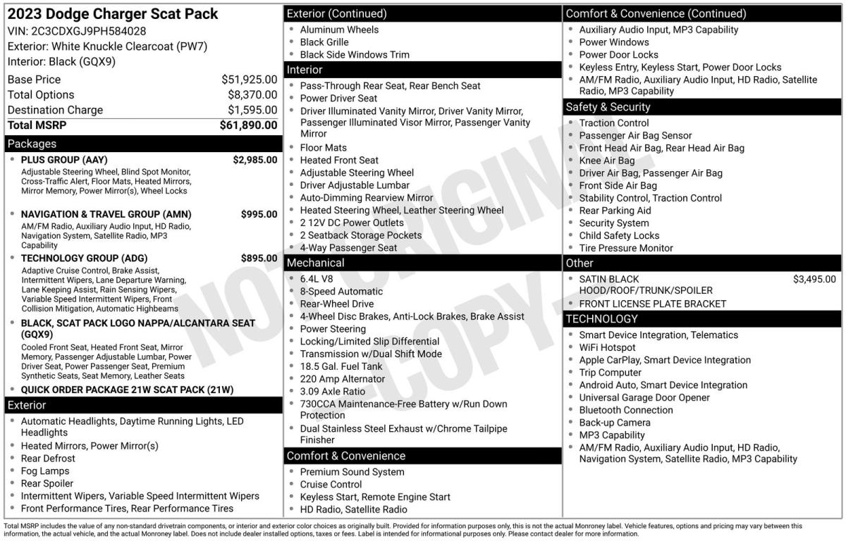 Experience the Thrill of the Open Road with this Stunning 2023 Dodge Charger R/T Scat PackThis 2023 Dodge Charger R/T Scat Pack is a true performance powerhouse, ready to take your driving experience to new heights. With its bold, aggressive styling and uncompromising SRT HEMI 6.4L V8 engine, this Charger is sure to turn heads wherever you go.Highlighted features include:• SATIN BLACK HOOD/ROOF/TRUNK/SPOILER• PLUS GROUP• NAVIGATION & TRAVEL GROUP• TECHNOLOGY GROUPThe Charger's impressive performance is complemented by a wealth of premium features, including:• Blind Spot & Cross Path Detection• Adaptive Cruise Control with Stop• Rain-Sensitive Windshield Wipers• Heated Steering Wheel• Ventilated Front SeatsStep inside this well-equipped Charger and you'll be greeted by a spacious, driver-focused cabin adorned with premium materials. The Uconnect 4C Nav system with an 8.4-inch display puts advanced connectivity and navigation at your fingertips, while the Scat Pack-exclusive Nappa/Alcantara seats provide exceptional comfort and support.With its powerful engine, striking good looks, and comprehensive suite of advanced technologies, this 2023 Dodge Charger R/T Scat Pack is the ultimate expression of American muscle. Whether you're carving through winding roads or cruising the highway, this Charger will deliver an unparalleled driving experience that is sure to leave a lasting impression.We're confident that this Charger will exceed your expectations. To experience its thrilling performance and premium amenities firsthand, we invite you to visit our showroom for a test drive. Our knowledgeable sales team is here to answer any questions you may have and help you discover the perfect Charger to fit your lifestyle.Don't miss your chance to own this exceptional 2023 Dodge Charger R/T Scat Pack. Contact us today to schedule your personal tour and experience the power and passion that only a Dodge can deliver.