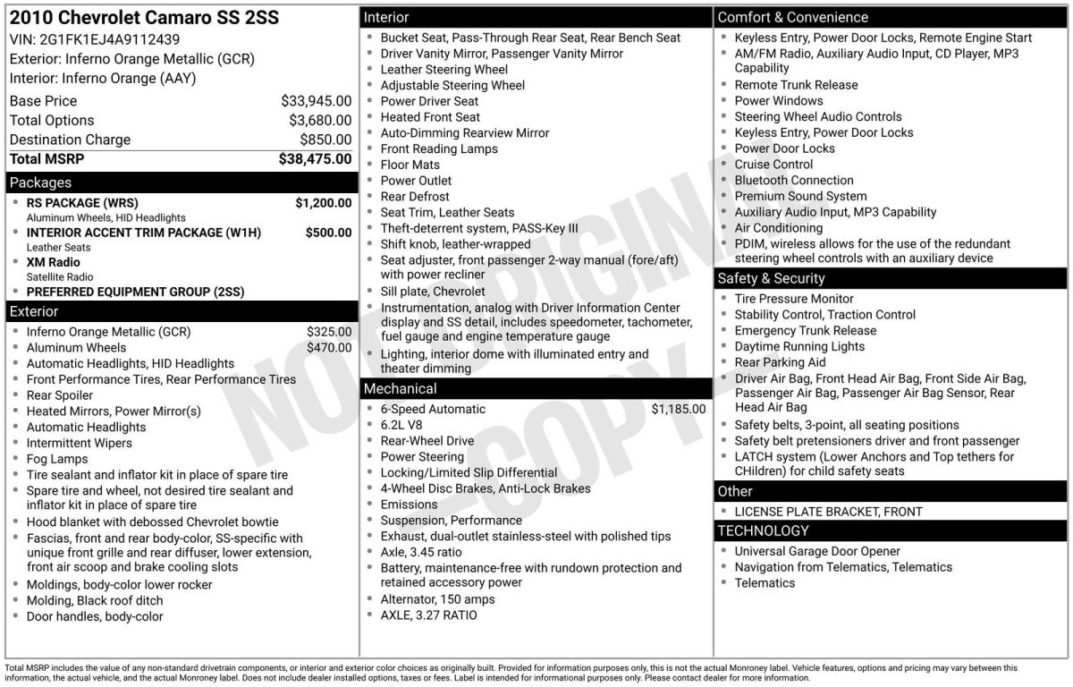6.2L V8 SFI. 2010 Chevrolet Camaro SS 2SS Recent Arrival! To see more quality vehicles like this one right just click on AaronFordofPoway.com or dial (858) 748-1400.Clean CARFAX. Reviews: * If you want a great-looking car that expresses your personality without forcing you to take out a second mortgage on the declining value of your home, you have to like the Camaro. In SS form its performance-per-dollar ratio is outstanding as well. Source: KBB.com