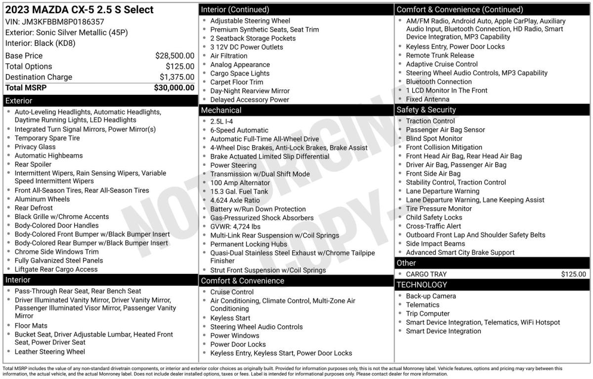 Discover the exceptional 2023 Mazda CX-5 2.5 S Select Package, a meticulously crafted SUV that combines style, performance, and unparalleled value. This stunning silver beauty boasts a SKYACTIV® 2.5L 4-Cylinder DOHC 16V engine, paired with a 6-Speed Automatic transmission and Mazda's renowned All-Wheel Drive system, delivering a captivating driving experience.• CARGO TRAYElevate your driving experience with this well-equipped CX-5. Featuring a host of premium amenities, including:• Collision Warning System• Parking Sensors• Premium Sound System• Push Button Ignition• Leather and Loaded InteriorDesigned with your comfort and convenience in mind, the CX-5 offers a spacious and well-appointed cabin, complete with heated front seats, dual-zone automatic climate control, and a user-friendly infotainment system with voice command capabilities.Boasting a clean CARFAX history and low mileage, this one-owner CX-5 is a true gem. With an impressive 24 MPG in the city and 30 MPG on the highway, this SUV delivers exceptional fuel efficiency, making it the perfect companion for your daily commute or weekend adventures.Safety is paramount, and the CX-5 delivers with a comprehensive suite of advanced driver-assistance technologies. From the Blind Spot Monitoring System to the Rear-View Camera, you can navigate the road with confidence and peace of mind.Discover the perfect balance of style, performance, and practicality in the 2023 Mazda CX-5 2.5 S Select Package. This exceptional SUV is waiting to elevate your driving experience. Visit our showroom today and let us demonstrate why this CX-5 is the perfect fit for you.