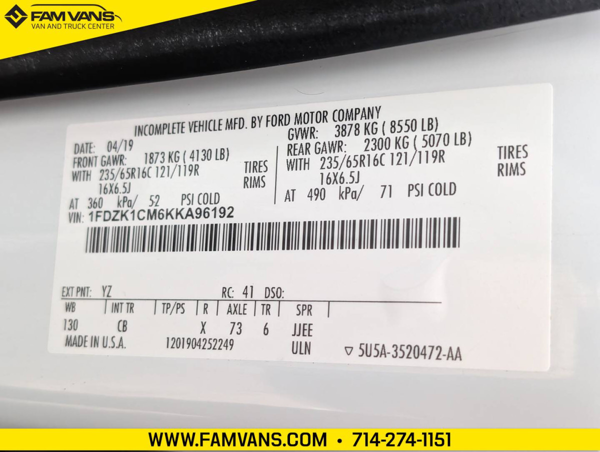 Here at FAM Vans we have over 350 vans and trucks in stock at any given time, plus we get fresh inventory every month. We can modify any vehicle to fit your needs or find the right one that fits your budget! Full Parts and Service departments. -130-in WB -GVWR: 8,550 LBS -Includes backup camera -Dimensions: 217.8 L x 98.7 H