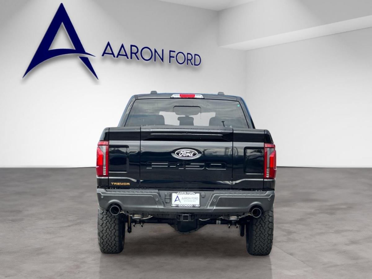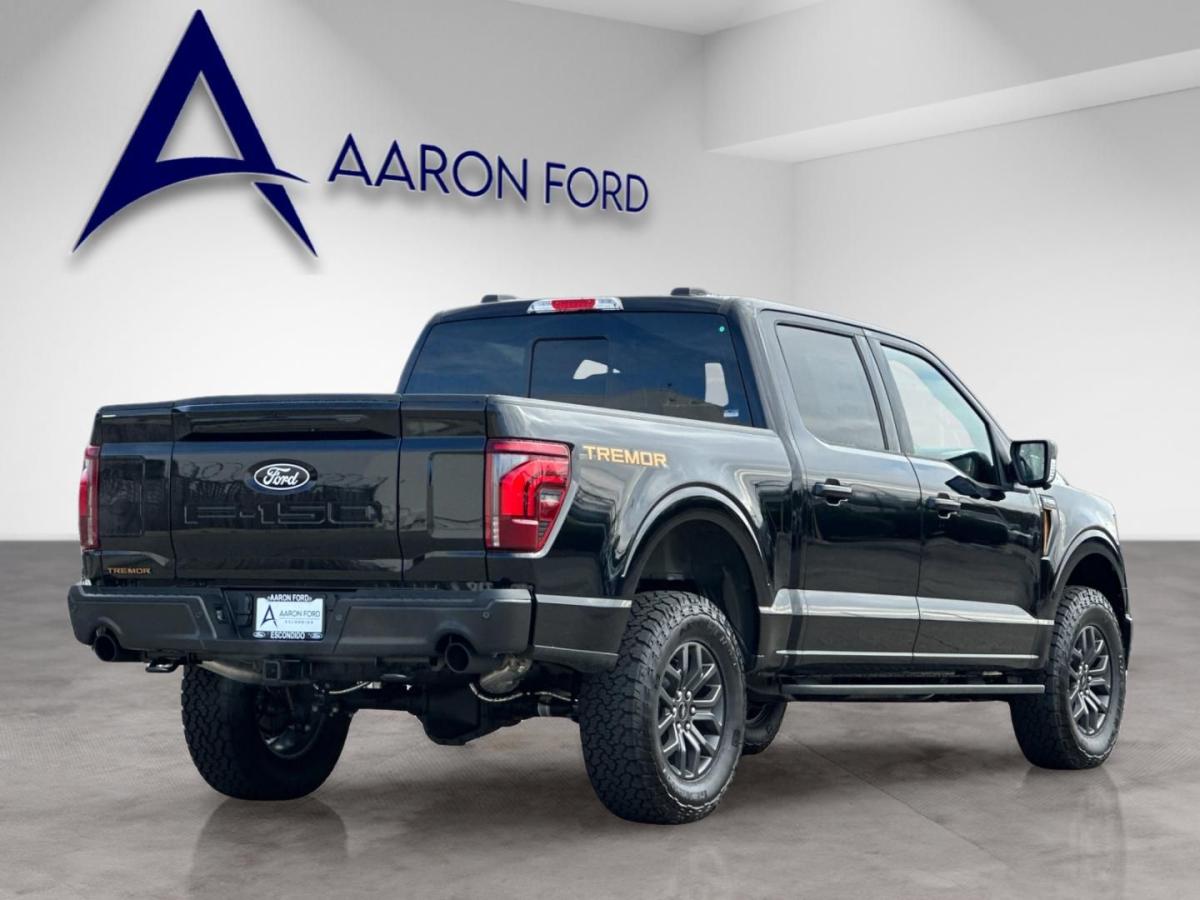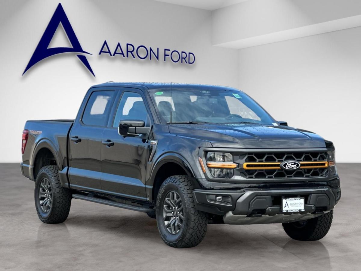 2025 Ford F-150 Tremor Agate Black Metallic4WD, 2nd Row Heated Seats, 4 Pickup Box Tie-Down Plates, Ambient Lighting, Auto-Dimming Rear-View Mirror, Bed Utility Package, Console Worksurface, Equipment Group 402A High, Front Axle w/Torsen Differential, Heads-Up Display, Heated Steering Wheel, Integrated Trailer Brake Controller, LED Box Lighting, LED Taillamps, Media Bin Door, Mobile Office Package, Modular Front Bumper & Carbon Black Rear Bumper, Partitioned Lockable Rear Storage, Power Glass Heated Sideview Mirrors, Power Tailgate, Power-Adjustable Pedals w/Memory, Premium Wrapped Steering Wheel, Radio: B&O Unleashed Sound System by Bang & Olufsen, Rain-Sensing Wipers, Tow/Haul Package, Two-Speed Automatic AWD w/Mechanical Locking 4WD, Unique Tremor Leather-Trimmed Bucket Seats, Universal Garage Door Opener, Wireless Charging. 4WD 10-Speed Automatic 5.0L V817/22 City/Highway MPGAaron Ford of Escondido offers a comprehensive selection of new Ford vehicles, from the adventurous Bronco to the efficient Escape. Our dealership is committed to providing top-notch customer service and helping you find the perfect Ford to fit your lifestyle. Come see us and discover the Ford difference. Price includes: $2000 - Retail Bonus Cash. Exp. 04/30/2026 $2000 - Retail Customer Cash. Exp. 04/30/2026