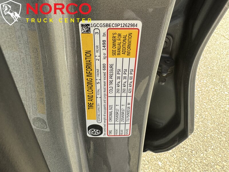 INSTALLED FEATURES: Air filtration, Front air conditioning, Front air conditioning zones: single, Airbag deactivation: occupant sensing passenger, Front airbags: dual, Side airbags: front, Side curtain airbags: front / rear, Antenna type: diversity / mast, Auxiliary audio input: Bluetooth / iPod/iPhone / jack / USB, Radio: AM/FM / touch screen display / voice operated, Radio data system, Satellite radio: SiriusXM, Speed sensitive volume control, Total speakers: 6, ABS: 4-wheel, Braking assist, Electronic brakeforce distribution, Electronic parking brake: auto off, Front brake type: ventilated disc, Power brakes, Rear brake type: ventilated disc, Floor material: carpet, Interior accents: aluminum, Shift knob trim: urethane, Steering wheel trim: urethane, Assist handle: passenger side / rear, Capless fuel filler system, Center console: front console with armrest and storage, Cupholders: front, Multi-function remote: keyless entry / panic alarm, One-touch windows: 1, Power outlet(s): 12V front / USB front / USB-C front, Power steering: variable/speed-proportional, Power windows: lockout button, Push-button start, Reading lights: front, Rearview mirror: manual day/night, Steering wheel: tilt, Steering wheel mounted controls: audio / multi-function / phone / voice control, Storage: door pockets / in dash, Vanity mirrors: dual, Bumper detail: rear step, Door handle color: black, Exhaust tip color: polished aluminum, Front bumper color: black, Grille color: black, Mirror color: black, Pickup bed light, Rear bumper color: black, Window trim: black, Connected in-car apps: app marketplace integration / Google Assistant / Google POIs / Google search, Infotainment: Chevrolet Infotainment System / Google Built-In, Infotainment screen size: 11.3 in., Smartphone integration: wireless Android Auto / wireless Apple CarPlay, Clock, Compass, Digital odometer, External temperature display, Fuel economy display: MPG / range, Gauge: oil pressure / tachometer, Instrument cluster screen size: 11 in., Multi-function display, Trip odometer, Warnings and reminders: coolant temperature warning / low fuel level / low oil level / maintenance due, Daytime running lights, Headlights: auto delay off / auto high beam dimmer / auto on/off / halogen / wiper activated, Side mirror adjustments: manual folding / power, Auto start/stop, Battery: maintenance-free, Battery saver, Cylinder deactivation, Automatic emergency braking: front / front pedestrian, Camera system: rearview, Check rear seat reminder, Child safety door locks, Child seat anchors: LATCH system, Lane deviation sensors, Lane keeping assist, Pre-collision warning system: audible warning / pedestrian detection / visual warning, Programmable safety key, Rearview monitor: in dash, Emergency locking retractors: front, Front seatbelts: 3-point, Rear seatbelts: 3-point, Seatbelt force limiters: front, Seatbelt pretensioners: front, Seatbelt warning sensor: front, Driver seat manual adjustments: 6 / height / reclining, Front headrests: 2 / adjustable, Front seat type: bucket, Passenger seat manual adjustments: 4 / reclining, Rear headrests: 3 / foldable, Rear seat folding: folds up, Rear seat type: 60-40 split bench, Upholstery: cloth, Anti-theft system: alarm / vehicle immobilizer, Power door locks: anti-lockout / auto-locking, Hill holder control, Stability control, Traction control, Trailer stability control, Front shock type: twin-tube gas, Front spring type: coil, Front stabilizer bar, Front struts, Front suspension classification: independent, Front suspension type: upper and lower control arms, Rear shock type: twin-tube gas, Rear spring type: leaf, Rear suspension classification: solid live axle, Rear suspension type: multi-leaf, Driver assistance app: roadside assistance, Electronic messaging assistance: voice operated / with read function, Hands-free phone call integration: voice operated, Navigation system: hard drive / touch screen display / voice operated, Satellite communications: OnStar / voice guided directions, Smart device app compatibility: Amazon Alexa / myChevrolet with Connected Access, Smart device app function: engine start / horn/light operation / lock operation / maintenance scheduling / maintenance status / vehicle location, Wi-Fi: hotspot, Wireless data link: Bluetooth, Trailer backup guidance, Spare tire mount location: underbody, Spare tire size: temporary, Spare wheel type: steel, Tire Pressure Monitoring System, Wheels: steel, Front wipers: variable intermittent, Power windows: safety reverse, Solar-tinted glass: front