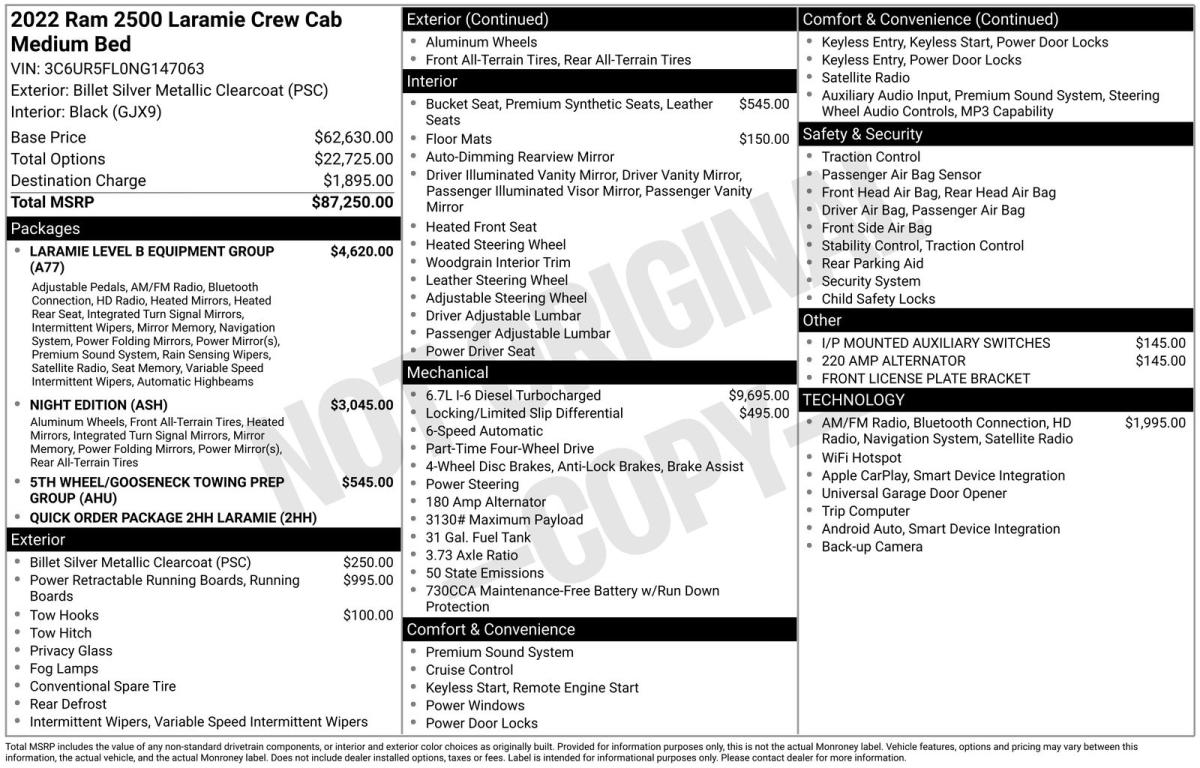 Elevate your driving experience with this exceptional 2022 Ram 2500 Laramie. Boasting a powerful Cummins 6.7L I6 Turbodiesel engine, paired with a 6-speed automatic transmission and 4-wheel drive, this truck is built to conquer any terrain. Adorned in a sleek Silver exterior, this Laramie model is packed with a wealth of premium features that will elevate your driving experience.Highlights of this well-equipped Ram 2500 include:• 6.7L I-6 Diesel Turbocharged (Cummins) engine• Laramie Level B Equipment Group• Night Edition package• 12" Touchscreen Display with Uconnect 5 Navigation• 17 Speaker harman kardon Premium Sound System• Power Deployable Running Boards• 5th Wheel/Gooseneck Towing Prep Group• Black, Leather Trimmed Bucket Seats• Anti-Spin Differential Rear AxleThis Ram 2500 Laramie is more than just a capable workhorse; it's a true luxury vehicle that will elevate your driving experience. The Laramie Level B Equipment Group adds a host of premium features, including a power adjustable driver's seat with memory, heated second-row seats, and a 17-speaker harman kardon premium sound system. The Night Edition package further enhances the exterior with sleek black accents, including the grille, badging, and 20-inch black painted aluminum wheels.Beyond its impressive capabilities, this Ram 2500 Laramie offers unparalleled comfort and convenience. The 12-inch touchscreen display with Uconnect 5 Navigation provides seamless connectivity, while the power deployable running boards make entry and exit a breeze. The 5th Wheel/Gooseneck Towing Prep Group ensures you can tackle even the most demanding hauling tasks with confidence.Elevate your driving experience and make a statement on the road with this exceptional 2022 Ram 2500 Laramie. Contact us today to schedule a test drive and discover the power and luxury that this truck has to offer.