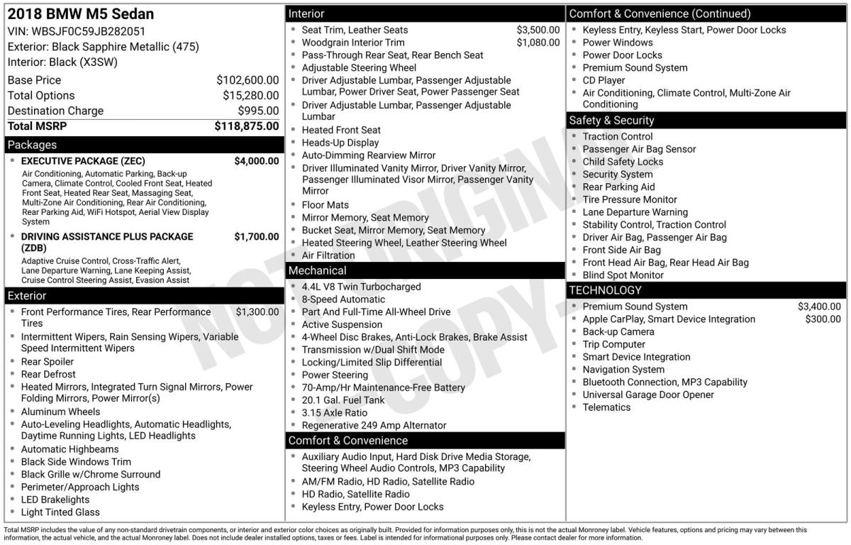 Elevate your driving experience with this exceptional 2018 BMW M5 Base. Engineered to thrill, this high-performance sedan delivers unparalleled power and sophistication.Boasting a robust 4.4L V8 Turbocharged engine that produces an impressive 600 horsepower, the M5 effortlessly blends raw power with refined handling. Paired with an 8-speed automatic transmission and BMW's renowned xDrive all-wheel-drive system, this vehicle offers uncompromising performance and control in any driving condition.Key features include:• EXECUTIVE PACKAGE: Enjoy the convenience of a WiFi hotspot, 4-zone automatic climate control, heated and ventilated front seats, and a stunning Bowers & Wilkins Diamond Surround Sound System.• DRIVING ASSISTANCE PLUS PACKAGE: Elevate your safety with advanced driver assistance technologies, including active cruise control, lane keeping assistant, and cross-traffic alert.• 20-inch Black M double-spoke wheels with mixed performance tires for an aggressive, sporty stance.• Piano Finish Black interior trim for a sophisticated, high-end aesthetic.• Apple CarPlay compatibility for seamless smartphone integration.The attention to detail is evident throughout, from the luxurious Merino leather upholstery to the front massaging seats and soft-close automatic doors. This M5 is a true testament to BMW's commitment to engineering excellence and driving dynamics.Whether navigating the city streets or carving through winding roads, this 2018 BMW M5 Base will captivate your senses and elevate your driving experience. Schedule a test drive today and discover the power and prestige that only a BMW can deliver.