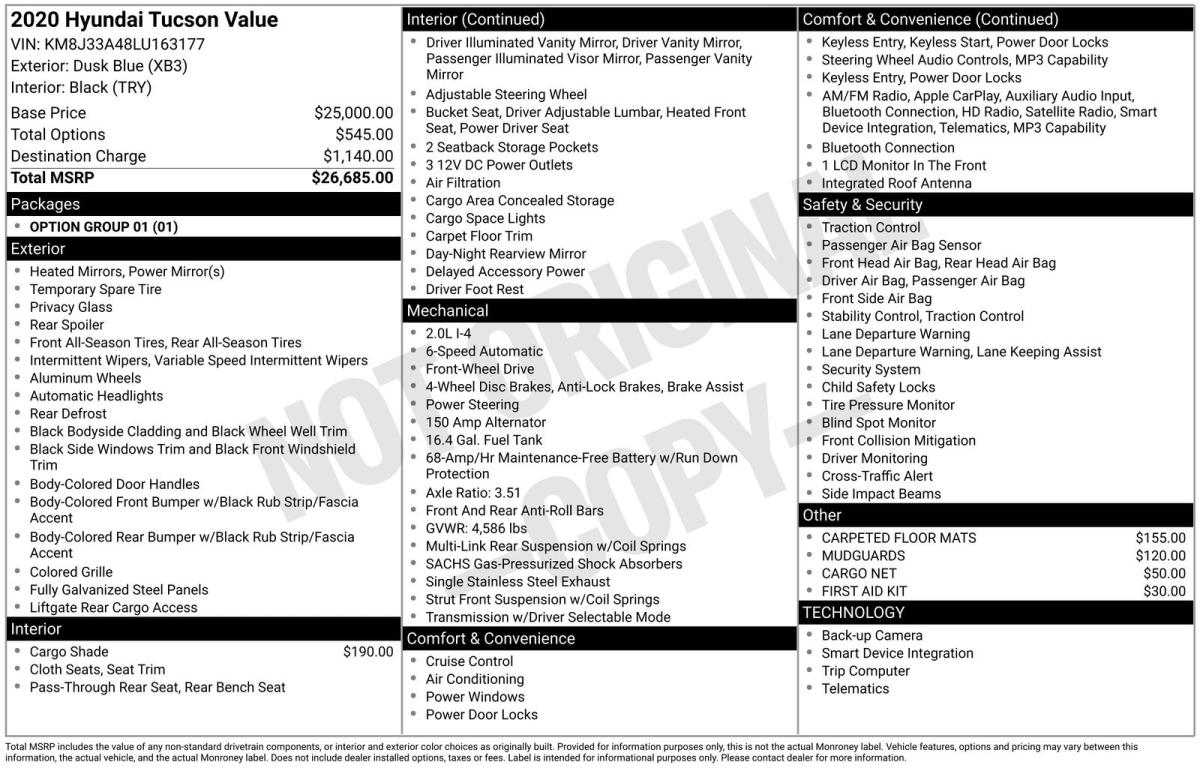 Discover the perfect balance of style, comfort, and capability with the 2020 Hyundai Tucson Value. This versatile SUV is ready to elevate your driving experience and meet the demands of your active lifestyle.Boasting a sleek blue exterior, the Tucson Value exudes a refined and modern aesthetic that is sure to turn heads. Under the hood, you'll find a powerful I4 engine paired with a smooth-shifting 6-Speed Automatic with Shiftronic transmission, delivering an impressive 23 city / 28 highway MPG.• Cargo Cover• Carpeted Floor Mats• Mudguards• Cargo Net• First Aid KitThe Tucson Value is packed with a wealth of premium features that prioritize your comfort and convenience. Enjoy the convenience of remote keyless entry, the versatility of a power driver's seat, and the connectivity of Apple CarPlay and Android Auto. Stay safe and in control with advanced safety technologies like Electronic Stability Control, Rear Camera, and more.The Tucson's spacious interior offers ample room for your passengers and cargo, with a split-folding rear seat and a generous cargo area. Upgrade your commute and weekend adventures with the premium YES Essentials Stain-Resistant Cloth Seat Trim, Heated Front Bucket Seats, and a Cargo Cover for added versatility.Discover the perfect blend of style, technology, and capability with the 2020 Hyundai Tucson Value. This SUV is ready to elevate your driving experience and take on all your daily tasks and weekend adventures with ease. Visit our showroom today to experience the Tucson Value for yourself and find out why it's the perfect choice for your next vehicle.