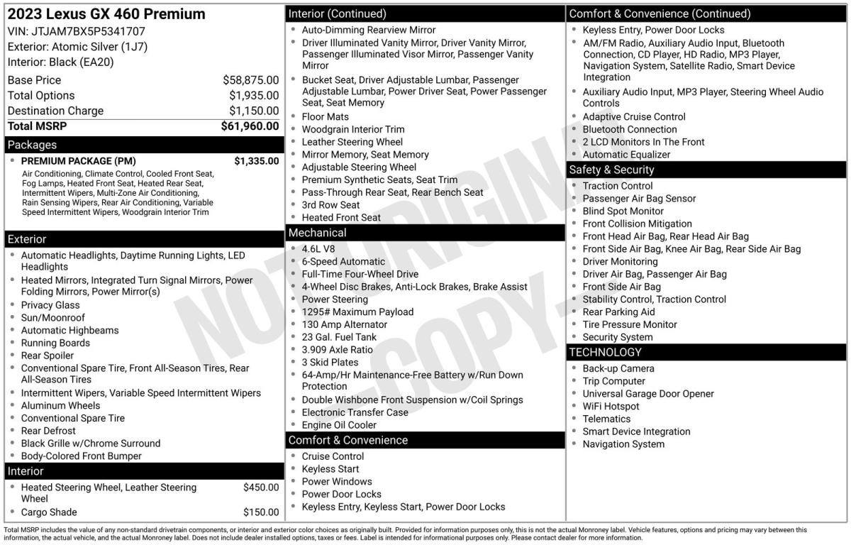 Experience the pinnacle of luxury and capability with this exceptional 2023 Lexus GX 460. Boasting a commanding presence and a wealth of premium features, this SUV is the perfect blend of refined sophistication and off-road prowess.Highlighted by a stunning Silver exterior and a well-appointed interior, this one-owner GX 460 is a true gem. Meticulously maintained and with low mileage, it's ready to provide you with years of exceptional performance and unparalleled comfort. Let's explore the remarkable attributes that make this Lexus an exceptional choice:• Collision Warning System• Parking Sensors• Premium Sound System• Push-Button Ignition• Navigation System• Premium Package• Leather and LoadedPowered by a robust 4.6L V8 engine and equipped with 4-wheel drive, the GX 460 delivers a commanding presence on the road and the confidence to tackle any adventure. With impressive fuel efficiency and a smooth 6-speed automatic transmission, this SUV strikes the perfect balance between power and efficiency.Step inside the cabin and you'll be enveloped in a world of luxury. Heated and ventilated front seats, a heated steering wheel, and dual-zone automatic climate control ensure your every drive is a serene and comfortable experience. The premium sound system and intuitive infotainment system keep you connected and entertained, while the spacious interior provides ample room for passengers and cargo.Safety is paramount in the GX 460, with a comprehensive suite of advanced driver-assistance features, including a Collision Warning System, Parking Sensors, and a Rear-View Camera. You can navigate with confidence, knowing that this Lexus is designed to protect you and your loved ones.With its exceptional build quality, uncompromising attention to detail, and a pedigree of reliability, this 2023 Lexus GX 460 is a true standout in the luxury SUV segment. Experience the difference for yourself and schedule a test drive today. We're confident that once you experience the exceptional craftsmanship and capabilities of this remarkable vehicle, you'll be convinced that it's the perfect addition to your lifestyle.