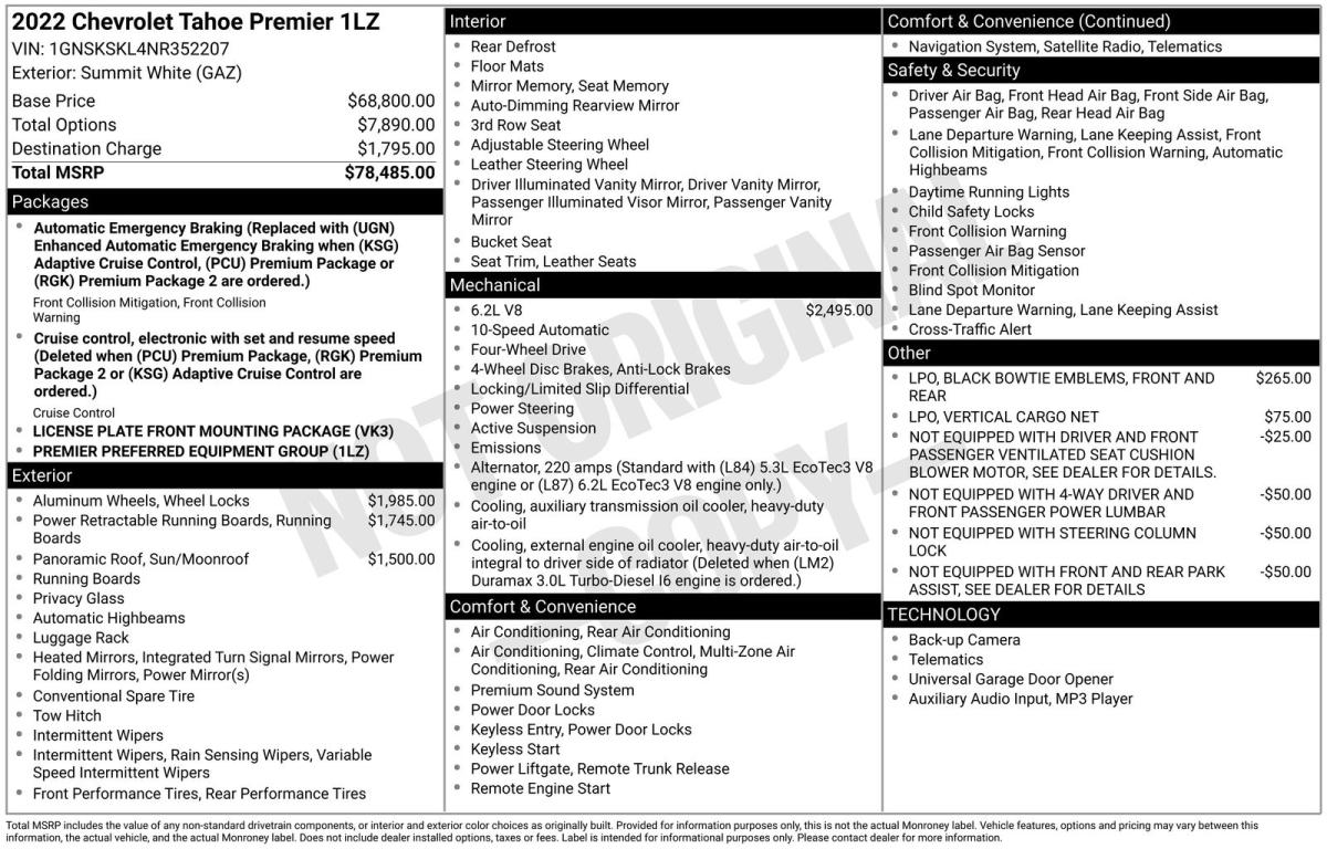 Commanding the road with unparalleled style and capability, the 2022 Chevrolet Tahoe Premier is a true masterpiece of modern engineering. This exceptional SUV boasts a captivating presence that is sure to turn heads wherever you go.Equipped with a powerful EcoTec3 6.2L V8 engine, the Tahoe Premier delivers an exhilarating driving experience. Paired with a 10-speed automatic transmission and 4-wheel drive, this SUV offers seamless acceleration and confident handling, making it the perfect companion for your adventures. Elevate your driving experience with features such as:• Power-Retractable Assist Steps• Panoramic Sunroof• Black Bowtie EmblemsIndulge in the luxurious interior of the Tahoe Premier, where premium leather seating and a Bose 10-speaker audio system create an unparalleled sense of comfort and refinement. Stay connected with the latest technology, including the Chevrolet Infotainment 3 Premium System, wireless charging, and Apple CarPlay/Android Auto integration.Safety is of the utmost importance, and the Tahoe Premier delivers with advanced driver-assistance features like Collision Warning System, Parking Sensors, and Rear Cross Traffic Alert. Experience the peace of mind that comes with owning a vehicle that prioritizes your well-being.With its impressive towing capacity, expansive cargo space, and seating for up to eight, the Tahoe Premier is the perfect choice for families, adventurers, and those who demand the very best. Elevate your driving experience and make a lasting impression with this exceptional SUV.We invite you to visit our showroom and experience the 2022 Chevrolet Tahoe Premier for yourself. Prepare to be captivated by its stunning design, exceptional performance, and unparalleled features. Let us help you discover the perfect vehicle to suit your lifestyle and needs.