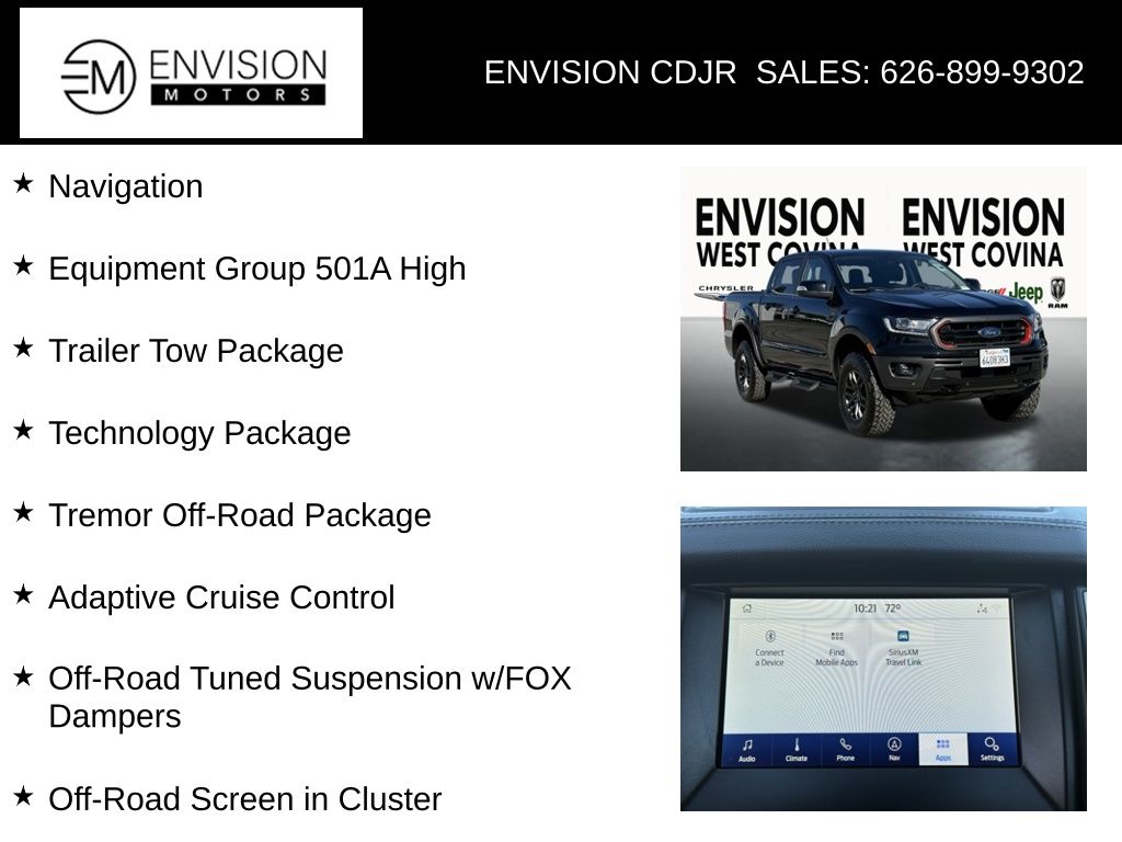 WE SPECIALIZE IN ALL CREDIT PROFILES! See what we can do for you! Call to find out (626) 899-9302.CARFAX One-Owner. Clean CARFAX.Odometer is 29326 miles below market average! 4WD, Adaptive Cruise Control, Equipment Group 501A High, Navigation, Off-Road Screen in Cluster, Off-Road Tuned Suspension w/FOX Dampers, Technology Package, Trailer Tow Package, Tremor Off-Road Package.Shadow Black2021 Ford Ranger Lariat 4WD 10-Speed Automatic EcoBoost 2.3L I4 GTDi DOHC Turbocharged VCT**********All Pricing and Advertised Prices for any/all vehicles offered for sale does not include dealer installed accessories which can be purchased for an additional cost.********** The Factory Rebates may not be available on this vehicle if you elect to take advantage of a Special Alternative APR or Special Lease program. Some Factory Rebates are California Resident specific and may vary for residents of other states. NO sales to Dealers, Brokers or Exporters. For out of state purchase, customers must be present to purchase. If shipping is required, dealership must facilitate; no exceptions. Please contact us for special Multi-Vehicle or Fleet pricing. Prices are plus government fees and taxes, any finance charges, $85 documentary fee, $29 electronic registration fee, any emission testing charge and $1.75 per new tire state tire fee. *** We make every effort to provide accurate information, but please verify before purchasing. Leasing & financing available on approved credit. Trade-ins accepted. Subject to prior sale.