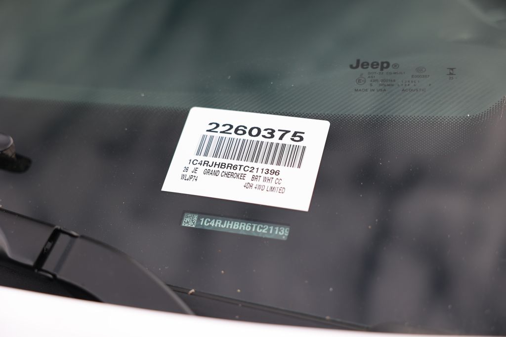 Elevate your driving experience with the 2026 Jeep Grand Cherokee Limited. This exceptional SUV combines unparalleled capability, refined comfort, and cutting-edge technology to deliver a truly remarkable driving experience.Boasting a stunning white/off-white exterior, this Grand Cherokee Limited is equipped with a host of premium features that set it apart. These include:- MOPAR Finishing Package- Quick Order Package 2BE Limited- MOPAR Front Splash Guards- MOPAR Rear Splash Guards with Jeep Logo- MOPAR Paint Protection Film- Navigation System- 10 Speakers- Active Noise Control System- Dual-Pane Panoramic Sunroof- Power Liftgate- 4G LTE Wi-Fi Hot Spot- Capri Leatherette Seats- Heated Front and Rear Seats- Power Passenger SeatUnder the hood, this Grand Cherokee Limited is powered by a robust 2.0L I4 PDI Turbocharged DOHC 16V engine, delivering an impressive 324 horsepower and 4-wheel drive capability. With an EPA-estimated 19 MPG in the city and 26 MPG on the highway, this SUV offers exceptional efficiency and performance.The interior of this Grand Cherokee Limited is designed with your comfort and convenience in mind. Enjoy the convenience of dual-zone automatic climate control, a heated steering wheel, and a premium Uconnect 5 infotainment system with a large 12.3-inch display. The spacious cabin and versatile cargo area make this SUV perfect for your daily commute, weekend adventures, and everything in between.Safety is also a top priority, with features like forward collision warning, automatic emergency braking, and a ParkView Rear Back-Up Camera ensuring you and your loved ones can travel with confidence.Experience the perfect balance of power, technology, and refinement in the 2026 Jeep Grand Cherokee Limited. Visit our showroom today and let us demonstrate how this exceptional SUV can elevate your driving experience.