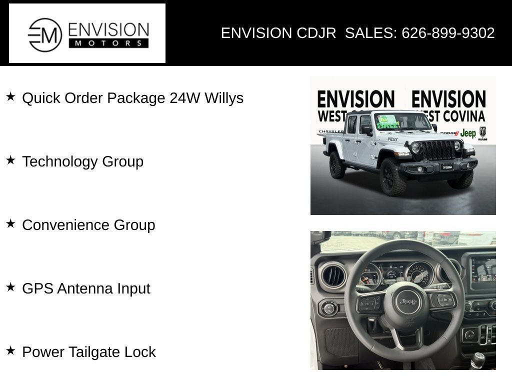 WE SPECIALIZE IN ALL CREDIT PROFILES! See what we can do for you! Call to find out (626) 899-9302.CARFAX One-Owner. Clean CARFAX.Convenience Group, GPS Antenna Input, Power Tailgate Lock, Quick Order Package 24W Willys, Technology Group.Bright White Clearcoat2023 Jeep Gladiator Willys 4WD 8-Speed Automatic 3.6L V6 24V VVT**********All Pricing and Advertised Prices for any/all vehicles offered for sale does not include dealer installed accessories which can be purchased for an additional cost.********** The Factory Rebates may not be available on this vehicle if you elect to take advantage of a Special Alternative APR or Special Lease program. Some Factory Rebates are California Resident specific and may vary for residents of other states. NO sales to Dealers, Brokers or Exporters. For out of state purchase, customers must be present to purchase. If shipping is required, dealership must facilitate; no exceptions. Please contact us for special Multi-Vehicle or Fleet pricing. Prices are plus government fees and taxes, any finance charges, $85 documentary fee, $29 electronic registration fee, any emission testing charge and $1.75 per new tire state tire fee. *** We make every effort to provide accurate information, but please verify before purchasing. Leasing & financing available on approved credit. Trade-ins accepted. Subject to prior sale.