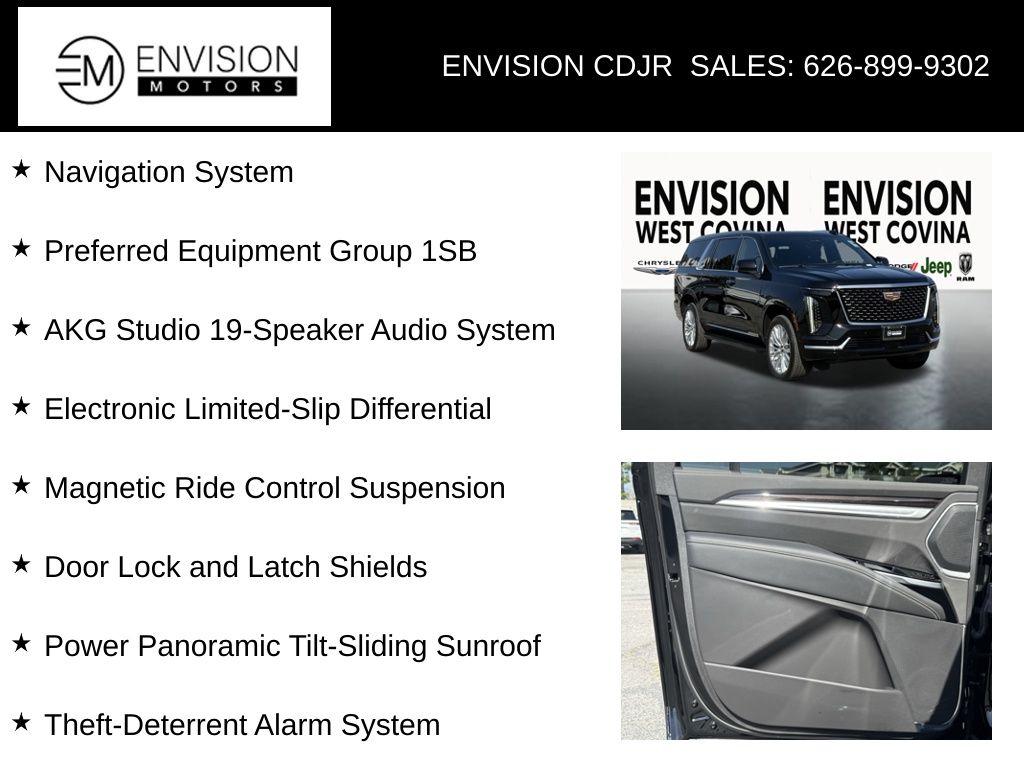 WE SPECIALIZE IN ALL CREDIT PROFILES! See what we can do for you! Call to find out (626) 899-9302.CARFAX One-Owner. Clean CARFAX.4WD, 2-Speed Active Transfer Case, AKG Studio 19-Speaker Audio System, Blind Zone Steering Assist with Trailering, Door Lock and Latch Shields, Electronic Limited-Slip Differential, Glass Breakage Sensor, Heated and Ventilated Driver and Front Passenger Seats, Hitch Guidance with Hitch View, Illuminating Front and Rear Sill Plates, Integrated Trailer Brake Controller, Magnetic Ride Control Suspension, Navigation System, Power Panoramic Tilt-Sliding Sunroof, Preferred Equipment Group 1SB, Reconfigurable Full-Color Head-Up Display, Running Board Assist Steps, Smart Trailer Integration Indicator, Theft-Deterrent Alarm System, Trailering App, Trailering Assist Guidelines, Vehicle Inclination Sensor, Vehicle Interior Movement Sensor, Wheel Locks, Wheels: 22" 9-Spoke Alloy with Polished Finish.Black Raven2025 Cadillac Escalade ESV Premium 4WD 10-Speed Automatic 6.2L V8**********All Pricing and Advertised Prices for any/all vehicles offered for sale does not include dealer installed accessories which can be purchased for an additional cost.********** The Factory Rebates may not be available on this vehicle if you elect to take advantage of a Special Alternative APR or Special Lease program. Some Factory Rebates are California Resident specific and may vary for residents of other states. NO sales to Dealers, Brokers or Exporters. For out of state purchase, customers must be present to purchase. If shipping is required, dealership must facilitate; no exceptions. Please contact us for special Multi-Vehicle or Fleet pricing. Prices are plus government fees and taxes, any finance charges, $85 documentary fee, $29 electronic registration fee, any emission testing charge and $1.75 per new tire state tire fee. *** We make every effort to provide accurate information, but please verify before purchasing. Leasing & financing available on approved credit. Trade-ins accepted. Subject to prior sale.