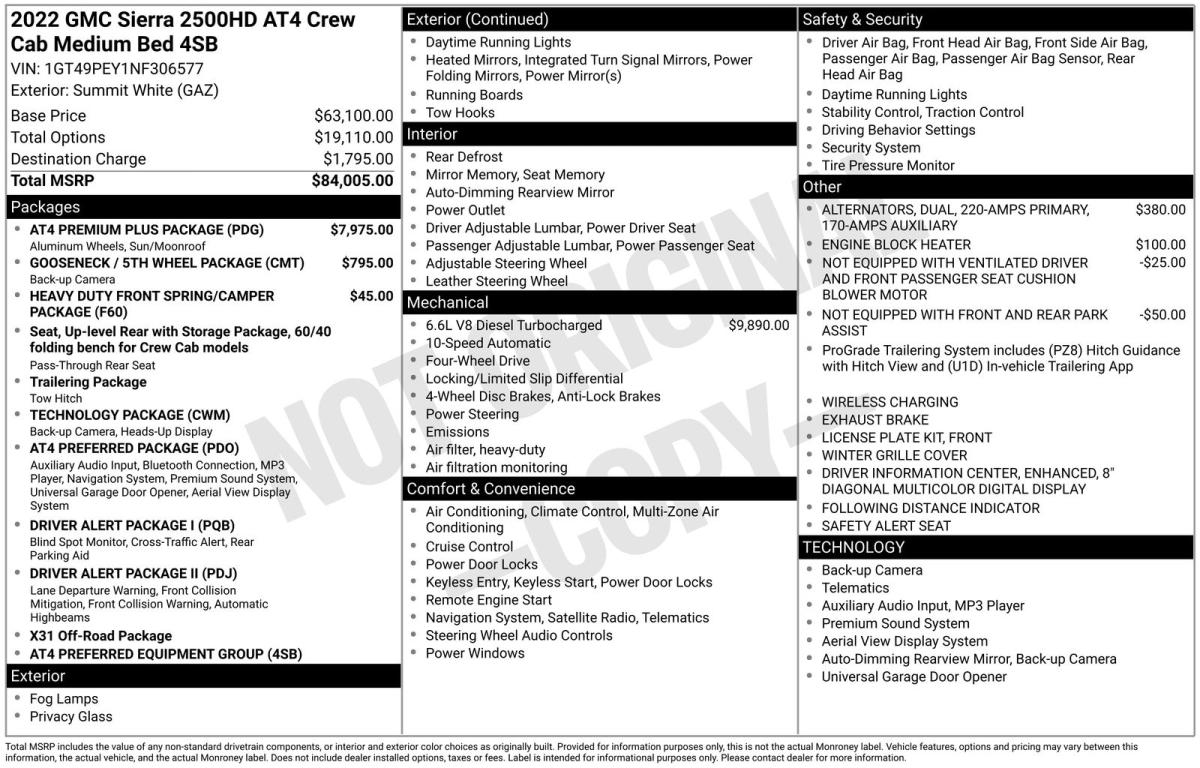 Discover the pinnacle of power and capability in the 2022 GMC Sierra 2500HD AT4. This exceptional heavy-duty truck is engineered to conquer any terrain, offering unparalleled performance and a host of premium features that elevate your driving experience.Highlighted by its impressive custom features, this Sierra 2500HD AT4 boasts a 6.5" lift with FOX Performance Elite BDS suspension, providing unmatched off-road prowess. Seamlessly integrated, the Wireless Apple CarPlay ensures you stay connected on the go. Prepare to be captivated by the sheer might of the Duramax 6.6L V8 Turbodiesel engine, delivering an astonishing 445 horsepower and 910 lb-ft of torque, all effortlessly channeled through a robust 10-speed automatic transmission.• Wireless Apple CarPlay• 6.5" Lift with FOX Performance Elite BDS suspension• Duramax 6.6L V8 Turbodiesel (445 hp, 910 lb-ft of torque)• 10-Speed Automatic Transmission• AT4 PREMIUM PLUS PACKAGE• GOOSENECK / 5TH WHEEL PACKAGE• HEAVY DUTY FRONT SPRING/CAMPER PACKAGEElevating your driving experience even further, this Sierra 2500HD AT4 is equipped with a comprehensive suite of advanced features. The AT4 PREMIUM PLUS PACKAGE enhances your ride with a power sunroof, 20" machined aluminum wheels, and the cutting-edge Technology Package. The GOOSENECK / 5TH WHEEL PACKAGE and HEAVY DUTY FRONT SPRING/CAMPER PACKAGE ensure you have the versatility to tackle any task, from towing heavy loads to conquering the great outdoors.Immerse yourself in the unparalleled comfort and convenience of this Sierra 2500HD AT4. Indulge in the luxurious perforated leather-appointed front seats with heating and ventilation, while the Bose Premium 7-speaker sound system delivers a captivating audio experience. Stay connected and informed with the intuitive 8" Driver Information Center and the 15" diagonal Head-Up Display.Safety is paramount, and this Sierra 2500HD AT4 delivers with a comprehensive suite of advanced driver-assistance technologies. From Automatic Emergency Braking to Lane Change Alert with Side Blind Zone Alert, you can navigate with confidence, knowing your safety is our top priority.Discover the ultimate expression of power, capability, and refinement in the 2022 GMC Sierra 2500HD AT4. Experience the unrivaled performance and premium features that make this truck the perfect companion for your adventures. Visit our showroom today and let us demonstrate how this exceptional vehicle can elevate your driving experience.