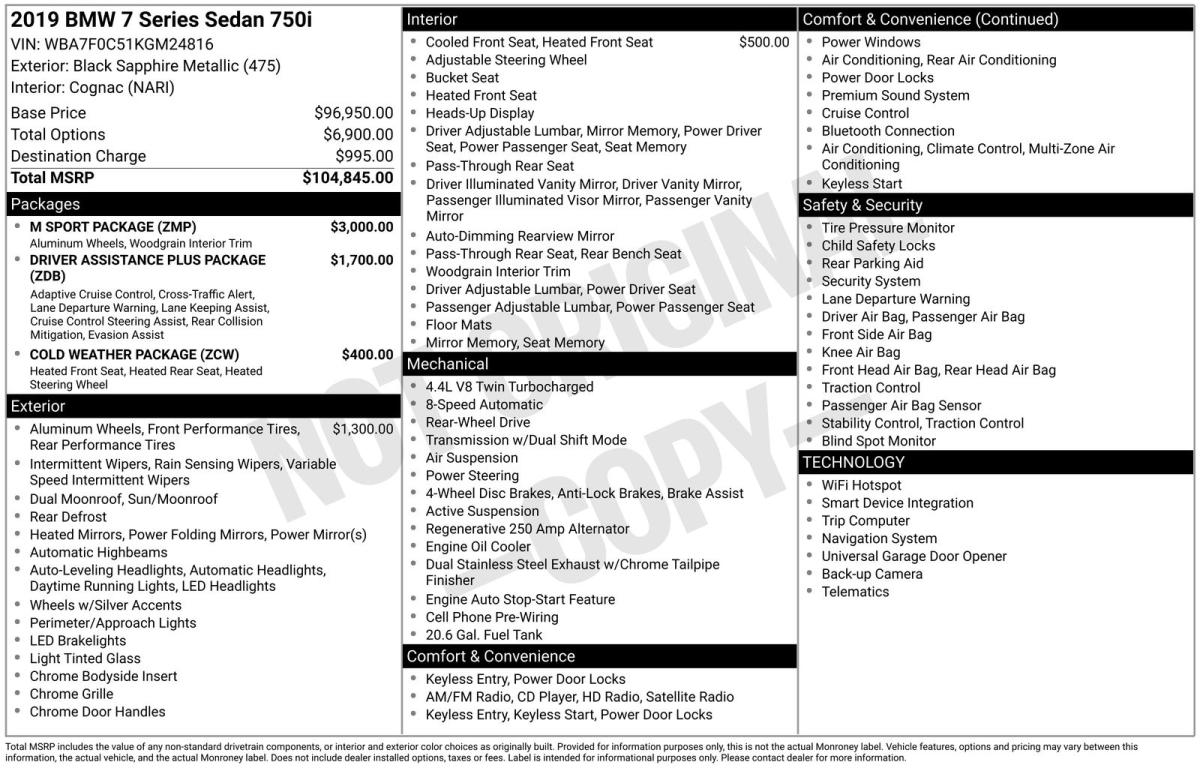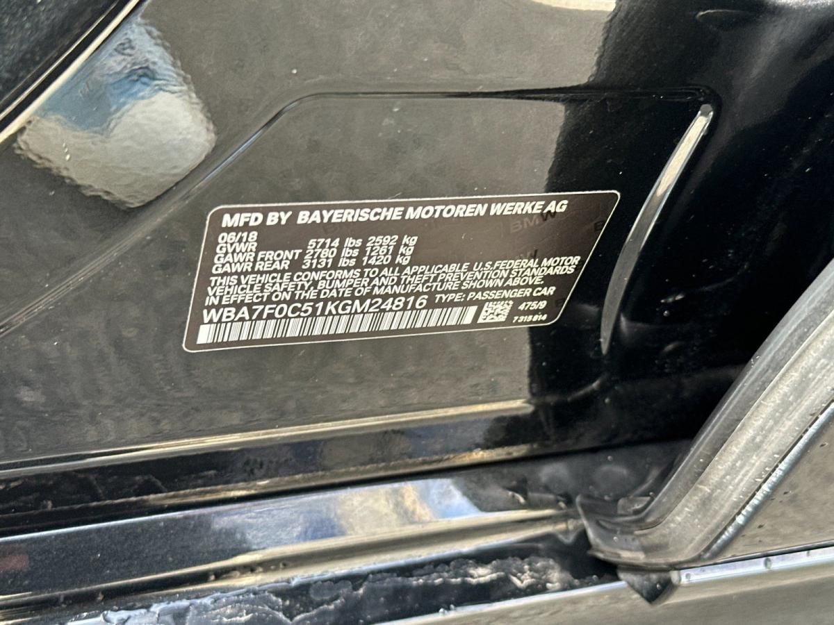 Elevate your driving experience with this stunning 2019 BMW 7 Series 750i. Boasting a powerful 4.4L V8 32V Twin Turbocharged engine and an 8-Speed Automatic transmission, this luxury sedan delivers an exhilarating performance with an impressive 18 city / 26 highway MPG.Highlighted features include:- M Sport Package- Driver Assistance Plus Package- 20" M Double-Spoke Style 648M Wheels- Front Ventilated Seats- Cold Weather Package with Heated Seats and Steering WheelThe M Sport Package enhances the already impressive presence of this 7 Series with Shadowline Exterior Trim, an M Sport Exhaust System, and a striking Aerodynamic Kit. The Driver Assistance Plus Package takes safety and convenience to the next level with cutting-edge technology like Active Driving Assistant Plus, Traffic Jam Assistant, and Active Lane Keeping Assistant.Indulge in the ultimate driving experience with the powerful yet efficient BMW 7 Series 750i. The combination of premium features, exceptional performance, and timeless styling make this vehicle a true standout in the luxury sedan segment. Schedule a test drive today and discover the unparalleled driving dynamics that only a BMW can deliver.This well-equipped 7 Series is finished in a sleek Black exterior, complemented by a sophisticated interior featuring Perforated Nappa Leather Upholstery and Fineline Black Wood Trim. The Front Ventilated Seats and Cold Weather Package ensure your comfort in any season, while the harman/kardon Surround Sound System provides an immersive audio experience.Experience the pinnacle of luxury and performance with this 2019 BMW 7 Series 750i. With its impressive array of advanced features and uncompromising build quality, this vehicle is sure to exceed your expectations. Contact us today to schedule a personalized demonstration and discover why the 7 Series is the ultimate expression of BMW's engineering excellence.
