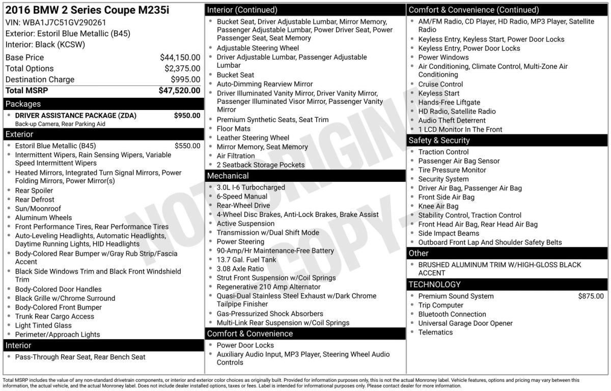 Gray 2016 BMW 2 Series M235i RWD I6Recent Arrival! Odometer is 3936 miles below market average! 20/31 City/Highway MPGAwards: * 2016 IIHS Top Safety Pick+Reviews: * Impressively quick, yet fuel-efficient with either engine; handling inspires confidence without sacrificing ride quality; interior is well made and has a long list of features. Source: Edmunds