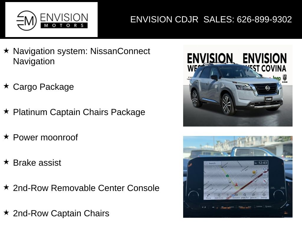 WE SPECIALIZE IN ALL CREDIT PROFILES! See what we can do for you! Call to find out (626) 899-9302.CARFAX One-Owner. Clean CARFAX.20/27 City/Highway MPG 2nd-Row Captain Chairs, 2nd-Row Removable Center Console, Brake assist, Cargo Package, Navigation system: NissanConnect Navigation, Platinum Captain Chairs Package, Power moonroof.Solid Gray/Super Black2023 Nissan Pathfinder Platinum FWD 9-Speed Automatic V6**********All Pricing and Advertised Prices for any/all vehicles offered for sale does not include dealer installed accessories which can be purchased for an additional cost.********** The Factory Rebates may not be available on this vehicle if you elect to take advantage of a Special Alternative APR or Special Lease program. Some Factory Rebates are California Resident specific and may vary for residents of other states. NO sales to Dealers, Brokers or Exporters. For out of state purchase, customers must be present to purchase. If shipping is required, dealership must facilitate; no exceptions. Please contact us for special Multi-Vehicle or Fleet pricing. Prices are plus government fees and taxes, any finance charges, $85 documentary fee, $29 electronic registration fee, any emission testing charge and $1.75 per new tire state tire fee. *** We make every effort to provide accurate information, but please verify before purchasing. Leasing & financing available on approved credit. Trade-ins accepted. Subject to prior sale.