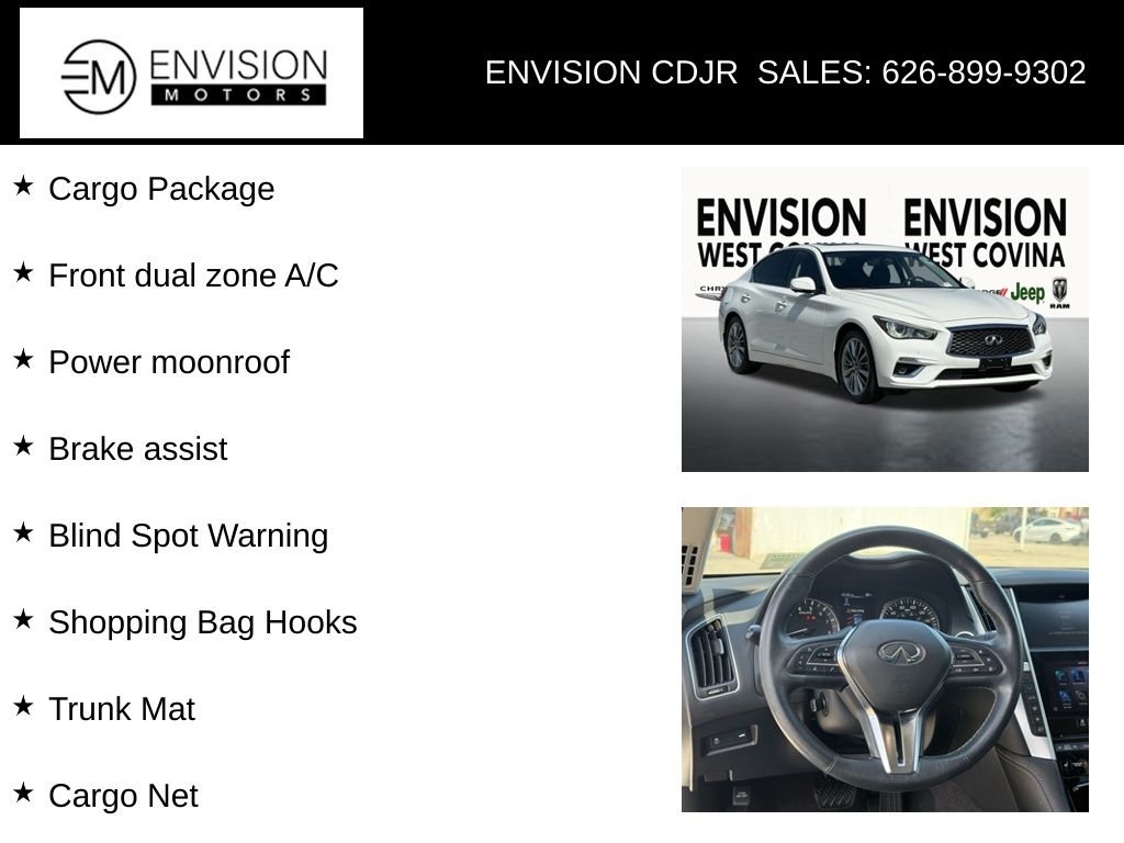 WE SPECIALIZE IN ALL CREDIT PROFILES! See what we can do for you! Call to find out (626) 899-9302.CARFAX One-Owner. Clean CARFAX.20/29 City/Highway MPG Blind Spot Warning, Brake assist, Cargo Net, Cargo Package, Front dual zone A/C, Power moonroof, Shopping Bag Hooks, Trunk Mat.Pure White2023 INFINITI Q50 LUXE RWD 7-Speed Automatic with Overdrive 3.0L V6**********All Pricing and Advertised Prices for any/all vehicles offered for sale does not include dealer installed accessories which can be purchased for an additional cost.********** The Factory Rebates may not be available on this vehicle if you elect to take advantage of a Special Alternative APR or Special Lease program. Some Factory Rebates are California Resident specific and may vary for residents of other states. NO sales to Dealers, Brokers or Exporters. For out of state purchase, customers must be present to purchase. If shipping is required, dealership must facilitate; no exceptions. Please contact us for special Multi-Vehicle or Fleet pricing. Prices are plus government fees and taxes, any finance charges, $85 documentary fee, $29 electronic registration fee, any emission testing charge and $1.75 per new tire state tire fee. *** We make every effort to provide accurate information, but please verify before purchasing. Leasing & financing available on approved credit. Trade-ins accepted. Subject to prior sale.