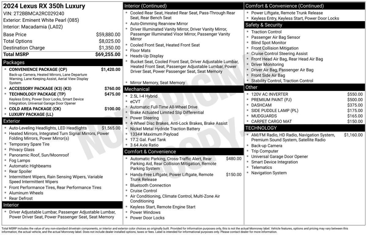 Experience the epitome of luxury and efficiency with this stunning 2024 Lexus RX 350h Luxury. Boasting a sleek and sophisticated design, this hybrid SUV combines the best of performance, comfort, and cutting-edge technology to elevate your driving experience.- Collision Warning System- Parking Sensors- Premium Sound System- Navigation System- Accessory Package (K3)- Cold Area Package- Convenience Package- Luxury Package- Technology PackageUnder the hood, the 2.5L I4 engine and advanced CVT transmission deliver an impressive blend of power and efficiency, with an EPA-estimated 37 MPGe in the city and 34 MPGe on the highway. The intelligent all-wheel-drive system ensures confident and responsive handling, no matter the road conditions.Step inside the RX 350h Luxury and be enveloped in a world of refined luxury. The spacious and well-appointed cabin features premium leather seating, heated and ventilated front seats, and a panoramic moonroof that floods the interior with natural light. The intuitive Lexus Interface infotainment system, complete with a 14-inch HD touchscreen display and wireless Apple CarPlay/Android Auto, keeps you connected and entertained.Safety is paramount in this Lexus, with a comprehensive suite of advanced driver-assistance technologies, including a Heads-Up Display, Parking Sensors, and the Lexus Safety System+ 2.5. These cutting-edge features work seamlessly to help keep you and your loved ones protected on every journey.With a clean CARFAX history and low mileage, this one-owner RX 350h Luxury is a true gem. Indulge in the perfect blend of luxury, efficiency, and technology with this exceptional Lexus SUV.Contact us today to schedule a test drive and experience the exceptional craftsmanship and performance of the 2024 Lexus RX 350h Luxury. We're confident you'll be captivated by its unparalleled combination of style, comfort, and innovation.