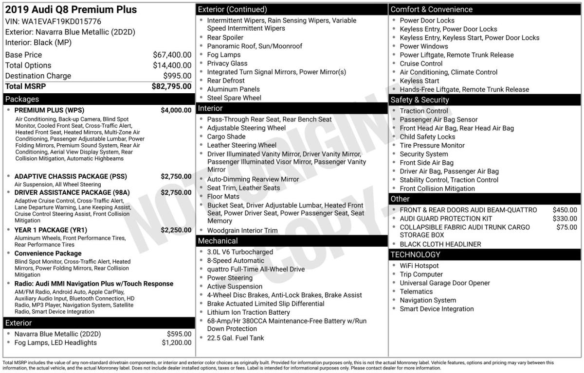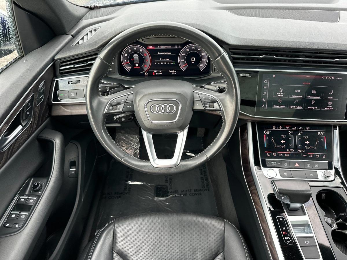 Discover the ultimate luxury SUV experience with this stunning 2019 Audi Q8 3.0T Premium Plus quattro. Boasting a captivating Navarra Blue Metallic exterior and an array of premium features, this exceptional vehicle is poised to elevate your driving enjoyment to new heights.- Bang & Olufsen 3D Premium Sound System- 4-Zone Climate Control- Adaptive Air Suspension- 4-Wheel-Steering- Audi Adaptive Cruise Assist- Heated Power Folding Auto-Dimming Exterior Mirrors- High-Beam Assist- Audi Active Lane Departure Warning- Audi Phone Box with Wireless Charging- Audi Side Assist with Pre Sense Rear- Illuminated Door Sills- Top View Camera System- Traffic Sign Recognition- Ventilated Front Seats- Wheels: 22" Audi Sport 5-V-Spoke Star DesignPowered by a potent 3.0L V6 Turbocharged engine delivering 335 horsepower, this Audi Q8 combines exceptional performance with uncompromising luxury. The quattro all-wheel-drive system ensures confident handling in any driving conditions, while the Adaptive Chassis Package with 4-Wheel-Steering and Adaptive Air Suspension provides a smooth, responsive, and highly customizable driving experience.Step inside the cabin and be captivated by the sophisticated design and premium materials. The Audi MMI Navigation Plus system with Touch Response offers intuitive control over the vehicle's advanced features, including the stunning Bang & Olufsen 3D Premium Sound System that will immerse you in your music. The Audi Side Assist with Pre Sense Rear and Top View Camera System provide enhanced awareness and safety, while the Audi Adaptive Cruise Assist and Traffic Sign Recognition help you navigate with ease.Elevate your driving experience with the Audi Q8's comprehensive Driver Assistance Package, which includes features like Audi Adaptive Cruise Assist, Traffic Jam Assist, Turn Assist, Predictive Efficiency Assist, and Intersection Assist. The Ambient Interior Lighting Plus Package sets the mood with multicolor ambient lighting, while the Audi Guard Protection Kit ensures your investment is well-protected.This exceptional Audi Q8 is waiting to be discovered. Schedule a test drive today and experience the pinnacle of luxury, performance, and technology in a truly remarkable SUV.