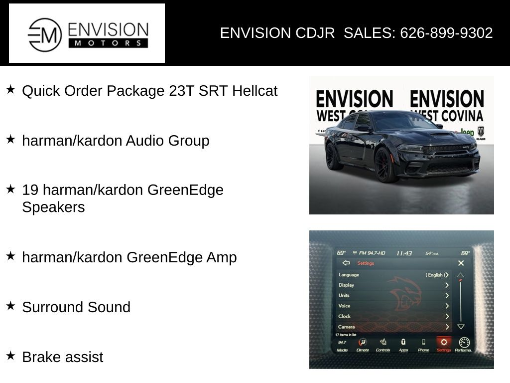 WE SPECIALIZE IN ALL CREDIT PROFILES! See what we can do for you! Call to find out (626) 899-9302.CARFAX One-Owner. Clean CARFAX.Odometer is 18023 miles below market average! Black Leather, 19 harman/kardon GreenEdge Speakers, Brake assist, harman/kardon Audio Group, harman/kardon GreenEdge Amp, Quick Order Package 23T SRT Hellcat, Surround Sound.Pitch Black Clearcoat2022 Dodge Charger SRT Hellcat Widebody RWD 8-Speed Automatic 6.2L 8-Cylinder SMPI Supercharged OHV**********All Pricing and Advertised Prices for any/all vehicles offered for sale does not include dealer installed accessories which can be purchased for an additional cost.********** The Factory Rebates may not be available on this vehicle if you elect to take advantage of a Special Alternative APR or Special Lease program. Some Factory Rebates are California Resident specific and may vary for residents of other states. NO sales to Dealers, Brokers or Exporters. For out of state purchase, customers must be present to purchase. If shipping is required, dealership must facilitate; no exceptions. Please contact us for special Multi-Vehicle or Fleet pricing. Prices are plus government fees and taxes, any finance charges, $85 documentary fee, $29 electronic registration fee, any emission testing charge and $1.75 per new tire state tire fee. *** We make every effort to provide accurate information, but please verify before purchasing. Leasing & financing available on approved credit. Trade-ins accepted. Subject to prior sale.