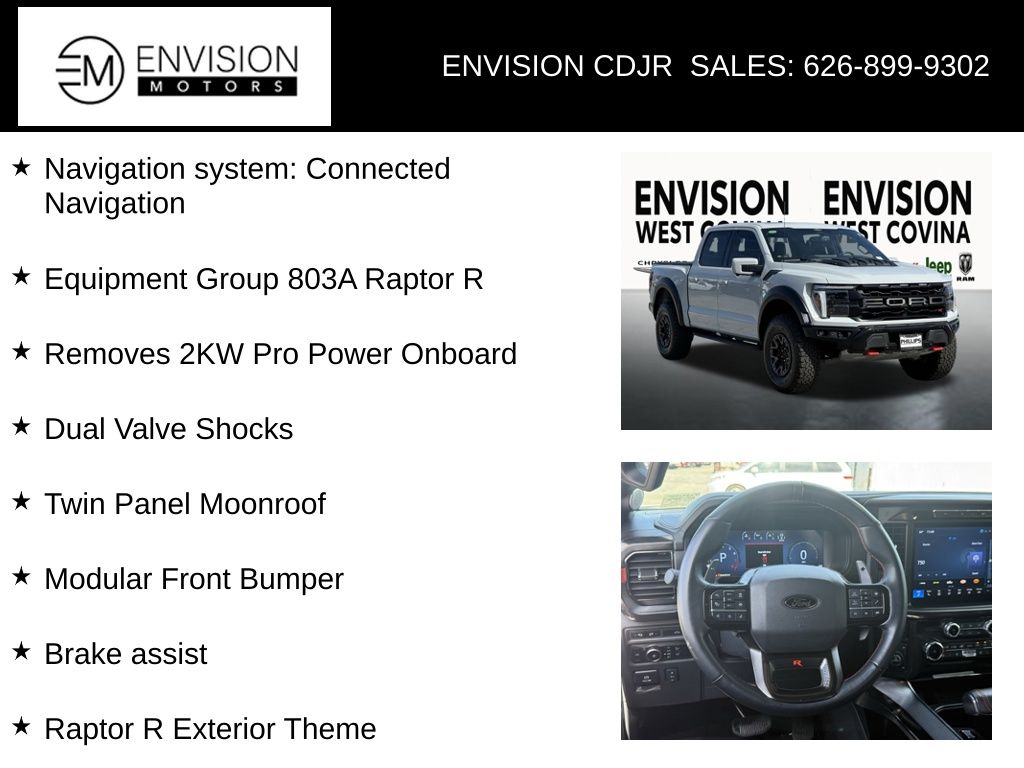 WE SPECIALIZE IN ALL CREDIT PROFILES! See what we can do for you! Call to find out (626) 899-9302.CARFAX One-Owner.4WD, Brake assist, Code Orange Stitching Doors & Instrument Panel, Code Orange Tow Hooks, Dual Valve Shocks, Equipment Group 803A Raptor R, Interior Code Orange Raptor R Badging, Modular Front Bumper, Navigation system: Connected Navigation, Raptor R Badge Tailgate Applique, Raptor R Exterior Graphics, Raptor R Exterior Theme, Raptor R Interior Theme, Raptor R Unique Grille, Raptor R Unique Hood Vent w/R Badge, RECARO w/Code Orange Stitching Front Seats, Removes 2KW Pro Power Onboard, Twin Panel Moonroof, Unique Carbon Fiber Appliques, Wheels: Raptor R Unique 17" Forged Aluminum.Avalanche Gray2024 Ford F-150 Raptor 4WD 10-Speed Automatic 5.2L V8**********All Pricing and Advertised Prices for any/all vehicles offered for sale does not include dealer installed accessories which can be purchased for an additional cost.********** The Factory Rebates may not be available on this vehicle if you elect to take advantage of a Special Alternative APR or Special Lease program. Some Factory Rebates are California Resident specific and may vary for residents of other states. NO sales to Dealers, Brokers or Exporters. For out of state purchase, customers must be present to purchase. If shipping is required, dealership must facilitate; no exceptions. Please contact us for special Multi-Vehicle or Fleet pricing. Prices are plus government fees and taxes, any finance charges, $85 documentary fee, $29 electronic registration fee, any emission testing charge and $1.75 per new tire state tire fee. *** We make every effort to provide accurate information, but please verify before purchasing. Leasing & financing available on approved credit. Trade-ins accepted. Subject to prior sale.
