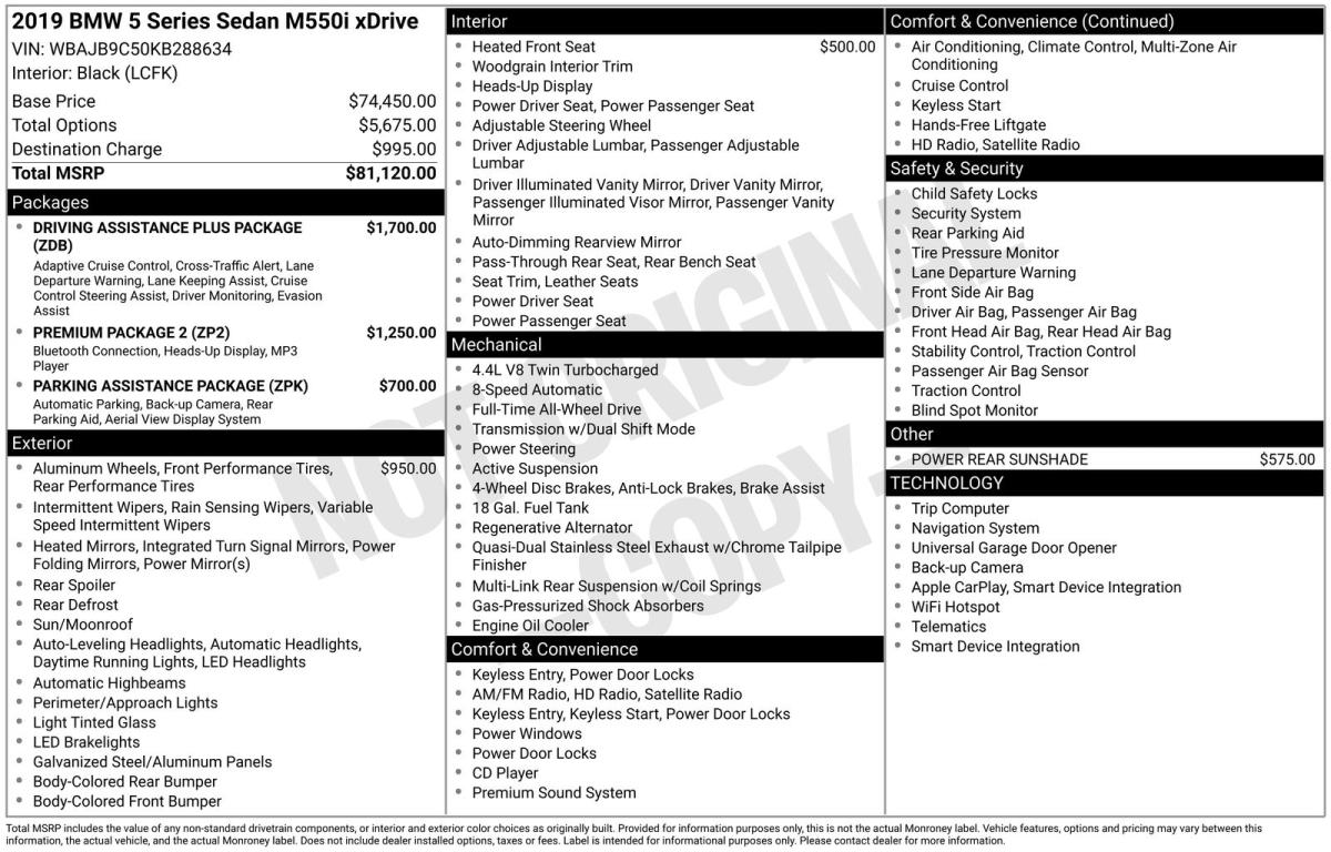 Elevate Your Driving Experience with this Exceptional 2019 BMW 5 Series M550i xDriveIntroducing a true masterpiece of engineering and design - the 2019 BMW 5 Series M550i xDrive. This captivating luxury sedan is poised to redefine your driving dynamics, offering a seamless blend of power, precision, and unparalleled sophistication.Meticulously equipped with a host of premium features, this M550i xDrive is tailored to elevate your driving experience:- Frozen Dark Silver Metallic exterior- 4.4L V8 Turbocharged DOHC 32V LEV3-ULEV125 456hp engine- 8-Speed Automatic transmission with All-Wheel Drive- Premium Package 2 with Gesture Control, Head-Up Display, Wireless Charging, and Enhanced USB & Bluetooth- Driving Assistance Plus Package with Active Driving Assistant Plus, Active Cruise Control, and more- Parking Assistance Package with Active Park Distance Control, Surround View, and Parking Assistant PlusStep inside this exceptional vehicle and you'll be greeted by a cabin that exudes unparalleled craftsmanship and attention to detail. The Dakota Leather upholstery, Fineline Ridge Wood Trim, and power-adjustable multi-contour seats create an environment of pure luxury and comfort.Beneath the sleek exterior lies a heart that beats with unbridled power. The 4.4L V8 Turbocharged engine delivers a thrilling 456 horsepower, propelling you from 0 to 60 mph in a mere 3.9 seconds. The seamless 8-speed automatic transmission and intelligent All-Wheel Drive system ensure exceptional handling and control, no matter the road conditions.But this BMW 5 Series is more than just raw power. It's a testament to engineering excellence, with a host of advanced technologies that enhance your driving experience. The Driving Assistance Plus Package, for instance, includes features like Active Cruise Control, Active Lane Keeping Assistant, and Evasion Aid, providing an extra layer of safety and confidence behind the wheel.For those who demand the best, this 2019 BMW 5 Series M550i xDrive is a true masterpiece. With its stunning design, uncompromising performance, and exceptional feature set, it's the ultimate expression of luxury, power, and sophistication. Experience the difference for yourself and schedule a test drive today.