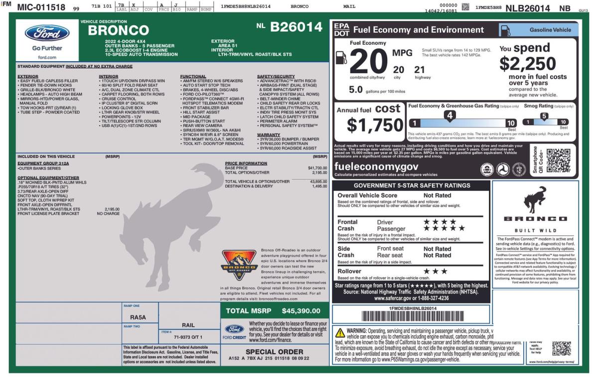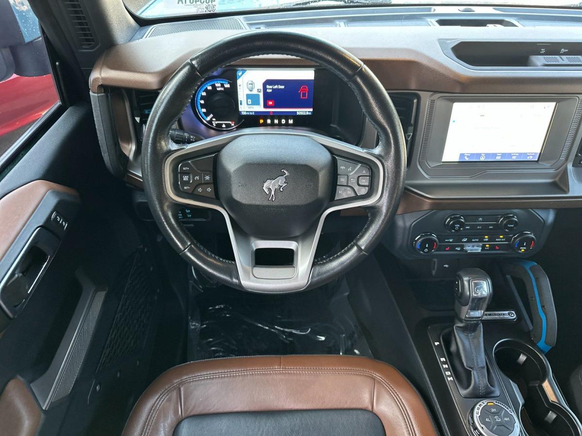 Discover the thrilling adventure that awaits with this 2022 Ford Bronco Outer Banks. Boasting a bold and rugged exterior in a stunning Green hue, this SUV is ready to take you on an unforgettable journey. Powered by a 2.3L EcoBoost I-4 engine paired with a 10-Speed Automatic transmission and 4-wheel drive, this Bronco delivers an exceptional blend of performance and capability.- ROAST W/BLACK ONYX- Heated Leather-Trimmed/Vinyl Bucket Seats- 10-way power driver seat, 8-way front passenger seat and second row armrest w/2 beverage holdersStep inside and experience the premium amenities that elevate your driving experience. Enjoy the convenience of SYNC 4 connectivity, SiriusXM radio, and a Rear Parking Camera. Stay comfortable with features like Air Conditioning, Power Windows, and Steering Wheel Mounted Audio Controls.Designed for the adventurous spirit, this Bronco Outer Banks is equipped with a host of off-road capabilities. The 4-Wheel Disc Brakes, Front Wheel Independent Suspension, and Traction Control ensure confident handling, while the Integrated Roll-Over Protection and Front Anti-Roll Bar provide added peace of mind.Safety is a top priority, with features like Dual Front Impact Airbags, Dual Front Side Impact Airbags, and Electronic Stability Control working to keep you and your passengers secure. The 911 Assist Emergency Communication System provides an additional layer of protection.This 2022 Ford Bronco Outer Banks is the perfect companion for those who crave the thrill of the great outdoors. With its exceptional performance, premium amenities, and rugged capabilities, it's ready to take you on the journey of a lifetime. Experience the difference for yourself – schedule a test drive today and discover the true essence of adventure.