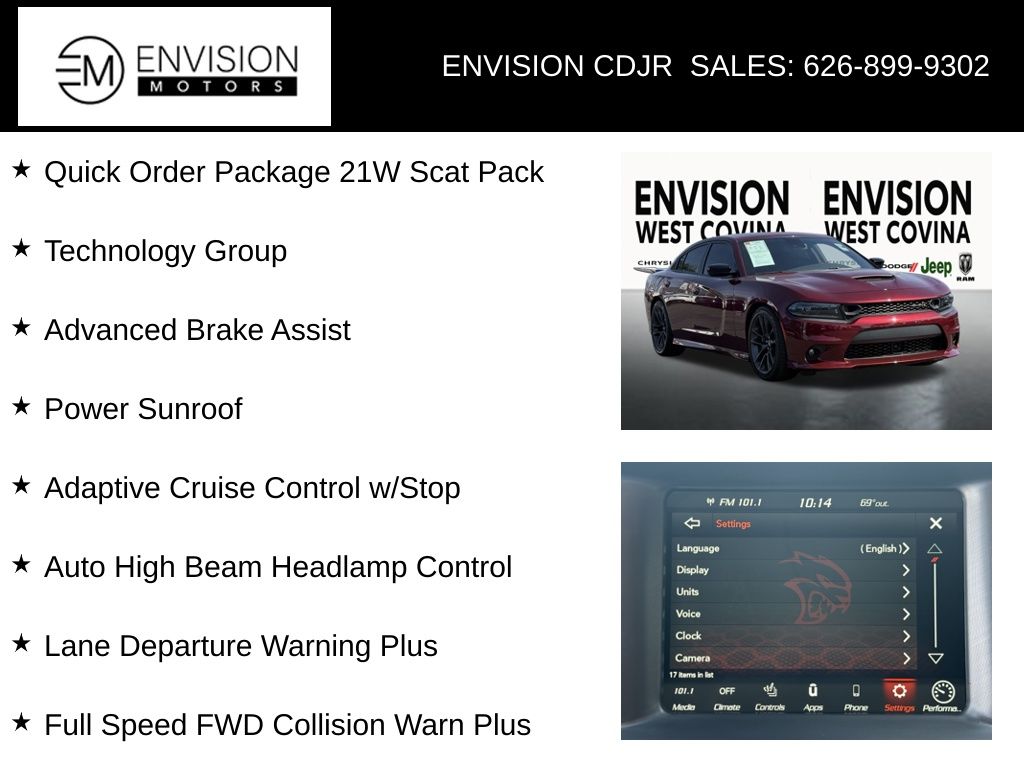 WE SPECIALIZE IN ALL CREDIT PROFILES! See what we can do for you! Call to find out (626) 899-9302.CARFAX One-Owner. Clean CARFAX.Odometer is 6257 miles below market average! Black Cloth, Adaptive Cruise Control w/Stop, Advanced Brake Assist, Auto High Beam Headlamp Control, Full Speed FWD Collision Warn Plus, Lane Departure Warning Plus, Power Sunroof, Quick Order Package 21W Scat Pack, Rain Sensitive Windshield Wipers, Technology Group.Octane Red Pearlcoat2023 Dodge Charger R/T Scat Pack RWD 8-Speed Automatic SRT HEMI 6.4L V8 MDS**********All Pricing and Advertised Prices for any/all vehicles offered for sale does not include dealer installed accessories which can be purchased for an additional cost.********** The Factory Rebates may not be available on this vehicle if you elect to take advantage of a Special Alternative APR or Special Lease program. Some Factory Rebates are California Resident specific and may vary for residents of other states. NO sales to Dealers, Brokers or Exporters. For out of state purchase, customers must be present to purchase. If shipping is required, dealership must facilitate; no exceptions. Please contact us for special Multi-Vehicle or Fleet pricing. Prices are plus government fees and taxes, any finance charges, $85 documentary fee, $29 electronic registration fee, any emission testing charge and $1.75 per new tire state tire fee. *** We make every effort to provide accurate information, but please verify before purchasing. Leasing & financing available on approved credit. Trade-ins accepted. Subject to prior sale.