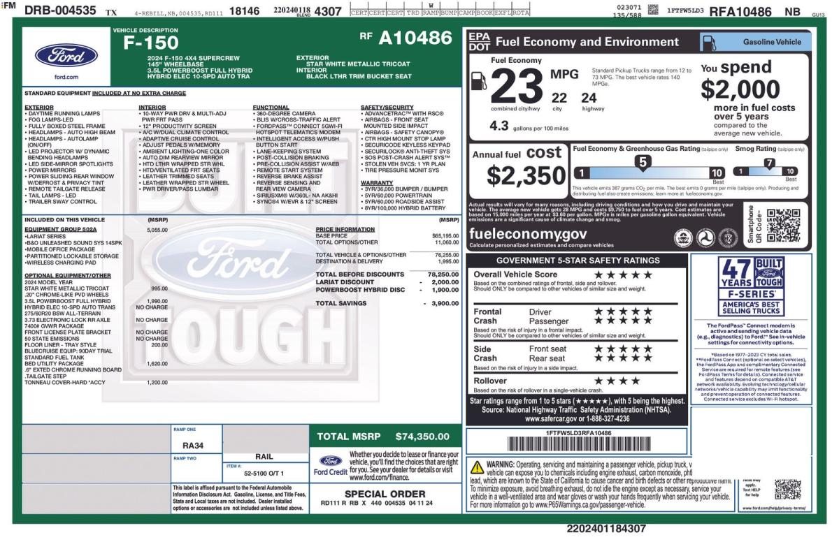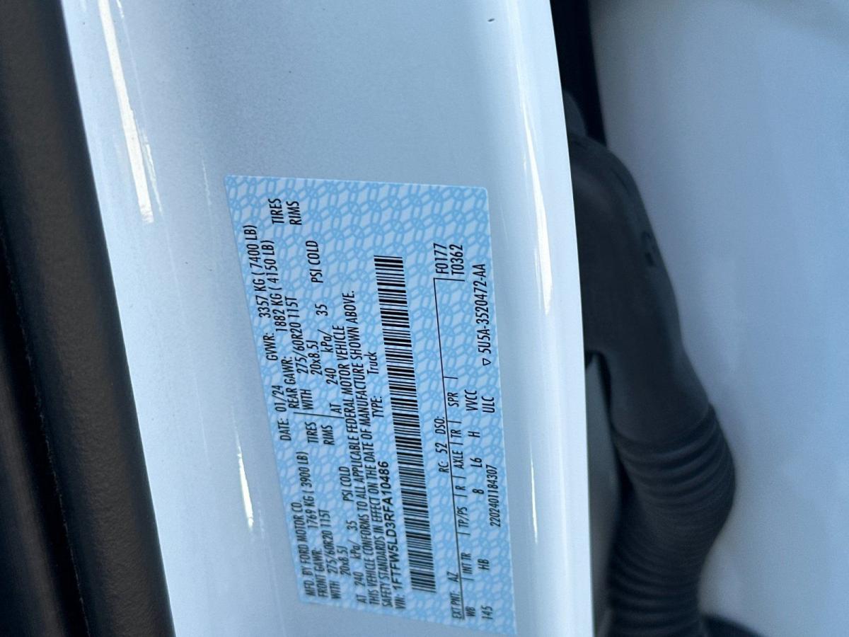 Discover the ultimate driving experience with this 2024 Ford F-150 Lariat. Boasting a powerful 3.5L PowerBoost Full-Hybrid V6 engine, this truck delivers exceptional performance and efficiency, with an impressive 22 city/24 highway MPG rating. Equipped with a 10-speed automatic transmission and 4-wheel drive, this F-150 is ready to tackle any terrain with confidence.- Bed Utility Package: Includes LED box lighting, pro access tailgate, power tailgate, 4 pickup box tie-down plates, and 6" extended running boards- Equipment Group 502A High: Includes 2nd row heated seats, mobile office package, wireless charging, partitioned lockable rear storage, console worksurface, heads-up display, 6" extended chrome running boards, and a premium B&O Unleashed sound system- Mobile Office Package- Navigation system: Connected Navigation- Radio: B&O Unleashed Sound System by Bang & Olufsen- Power Tailgate- 4 Pickup Box Tie-Down Plates- 6" Extended Chrome Running Boards- LED Box Lighting- Console Worksurface- Heads-Up Display- Wireless Charging- 2nd Row Heated Seats- Partitioned Lockable Rear Storage- Pro Access TailgateThis stunning White exterior complements the rugged and sophisticated design of the F-150 Lariat, while the interior features premium leather-trimmed bucket seats, a heated steering wheel, and a host of advanced technology features to keep you connected and in control. From the powerful hybrid powertrain to the impressive array of smart and convenient features, this 2024 Ford F-150 Lariat is the ultimate work and play partner.Imagine the possibilities with this versatile and capable truck. Whether you're hauling heavy loads, towing your trailer, or simply enjoying the open road, the F-150 Lariat is ready to rise to the occasion. Discover the perfect blend of power, efficiency, and luxury in this exceptional vehicle.Experience the difference for yourself. Visit our showroom today and let our knowledgeable team guide you through all the features and capabilities of this remarkable 2024 Ford F-150 Lariat. We're confident you'll be impressed by the uncompromising performance and premium amenities that make this truck a true standout in its class. Take the first step towards owning your dream vehicle and schedule a test drive today.