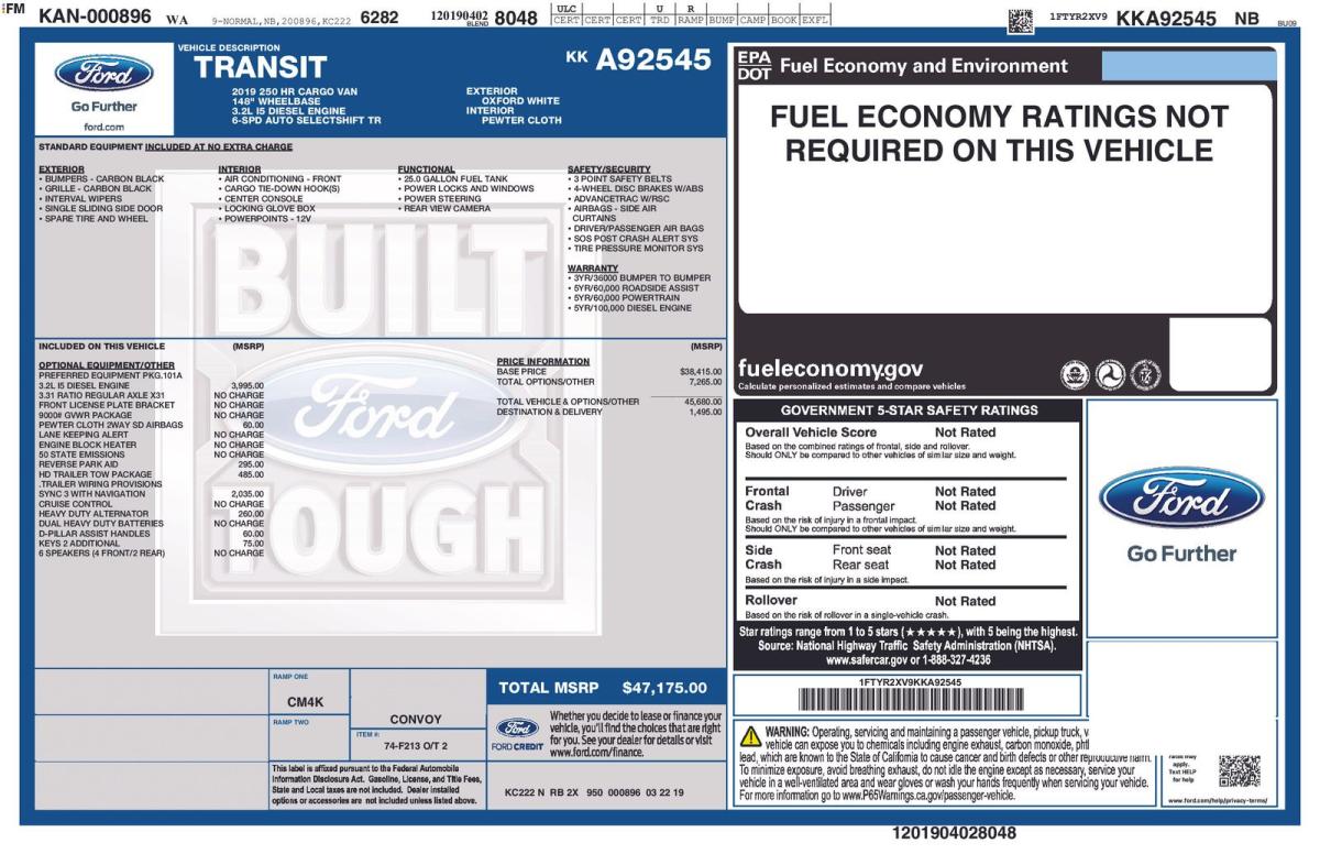 This 2019 Ford Transit-250 Base is a versatile and capable work van that can handle all your business needs. With its powerful 3.2L I5 Diesel Turbocharged engine, this Transit-250 delivers impressive performance and efficiency, making it the perfect choice for your commercial or fleet operations.- 3.2L I-5 Diesel Turbocharged (Power Stroke)- RADIO: AM/FM STEREO W/SYNC3/NAVIGATION- HEAVY-DUTY TRAILER TOW PACKAGE- CRUISE CONTROL W/MESSAGE CENTER- DUAL HEAVY-DUTY BATTERIES- HEAVY-DUTY ALTERNATOR- 2 ADDITIONAL KEYS (4 TOTAL)- ENGINE BLOCK HEATER- D PILLAR ASSIST HANDLES- PEWTER CLOTH DUAL BUCKET SEATSThe Transit-250 Base is packed with a host of features designed to make your job easier. The SYNC 3 Communications & Entertainment System keeps you connected with voice-activated controls, while the Reverse Sensing System provides added confidence when maneuvering in tight spaces. The Heavy-Duty Trailer Tow Package equips this van with the capability to handle even your most demanding hauling needs.Comfort and convenience are also prioritized, with features like Cruise Control with Message Center, Dual Heavy-Duty Batteries, and an Engine Block Heater. The Pewter Cloth Dual Bucket Seats offer a comfortable and supportive ride, while the D Pillar Assist Handles provide added stability and ease of access.Backed by Ford's reputation for reliability and durability, this Transit-250 Base is the perfect companion for your business. With its impressive capabilities, thoughtful features, and versatile design, it's ready to take on any challenge you throw its way. Experience the power and practicality of this exceptional work van today.Contact our sales team to schedule a test drive and see how this 2019 Ford Transit-250 Base can transform your business operations. We're confident you'll be impressed by its performance, functionality, and value. Take the first step towards a more productive and efficient future with this exceptional commercial vehicle.