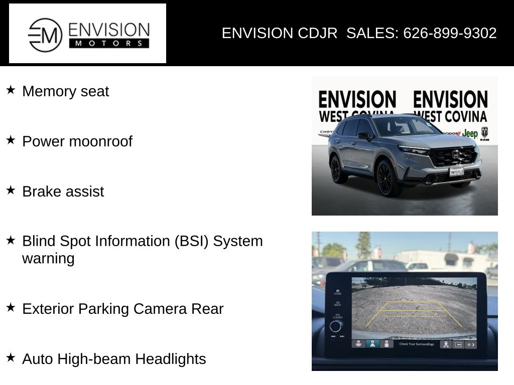 WE SPECIALIZE IN ALL CREDIT PROFILES! See what we can do for you! Call to find out (626) 899-9302.CARFAX One-Owner. Clean CARFAX.Odometer is 3503 miles below market average! 40/34 City/Highway MPG 2.0L I4 DOHC 16V, Auto High-beam Headlights, Blind Spot Information (BSI) System warning, Brake assist, Exterior Parking Camera Rear, Memory seat, Power moonroof.Urban Gray Pearl2025 Honda CR-V Hybrid Sport-L AWD eCVT 2.0L I4 DOHC 16V**********All Pricing and Advertised Prices for any/all vehicles offered for sale does not include dealer installed accessories which can be purchased for an additional cost.********** The Factory Rebates may not be available on this vehicle if you elect to take advantage of a Special Alternative APR or Special Lease program. Some Factory Rebates are California Resident specific and may vary for residents of other states. NO sales to Dealers, Brokers or Exporters. For out of state purchase, customers must be present to purchase. If shipping is required, dealership must facilitate; no exceptions. Please contact us for special Multi-Vehicle or Fleet pricing. Prices are plus government fees and taxes, any finance charges, $85 documentary fee, $29 electronic registration fee, any emission testing charge and $1.75 per new tire state tire fee. *** We make every effort to provide accurate information, but please verify before purchasing. Leasing & financing available on approved credit. Trade-ins accepted. Subject to prior sale.