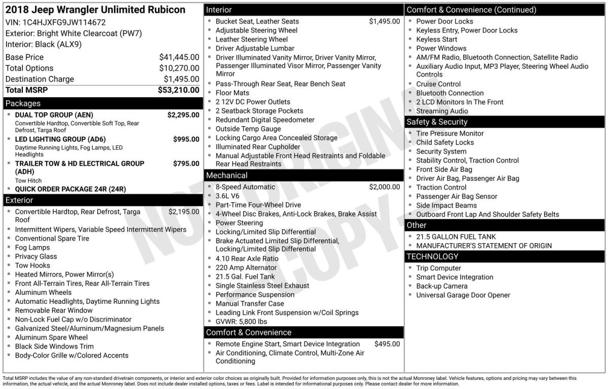 Discover the ultimate off-road companion in this meticulously maintained 2018 Jeep Wrangler Unlimited Rubicon. With its powerful 3.6L V6 engine, 8-speed automatic transmission, and legendary 4WD capability, this Wrangler is ready to take you on unforgettable adventures both on and off the beaten path.- Dual Top Group with Premium Black Sunrider Soft Top and Body Color 3-Piece Hard Top- LED Lighting Group with Daytime Running Lamps, Front LED Fog Lamps, LED Reflector Headlamps, and LED Taillamps- Trailer Tow & HD Electrical Group with Class II Receiver Hitch, 700 Amp Maintenance Free Battery, and 240 Amp Alternator- Remote Start System for added convenienceThe Wrangler Unlimited Rubicon's impressive list of features also includes:- Leather-trimmed bucket seats- Uconnect 4 with 7" display and Apple CarPlay/Android Auto- Parking sensors for easy maneuvering- Premium sound system for an immersive audio experienceThis one-owner Jeep Wrangler Unlimited Rubicon has been meticulously cared for, as evidenced by its clean CARFAX report and low mileage. With its rugged good looks, uncompromising off-road capability, and impressive list of premium amenities, this Wrangler is the perfect companion for those who seek adventure and the open road.Whether you're tackling the toughest terrain or cruising down the highway, this Jeep Wrangler Unlimited Rubicon is ready to deliver an unparalleled driving experience. Schedule a test drive today and discover the freedom and capability that only a Wrangler can provide.
