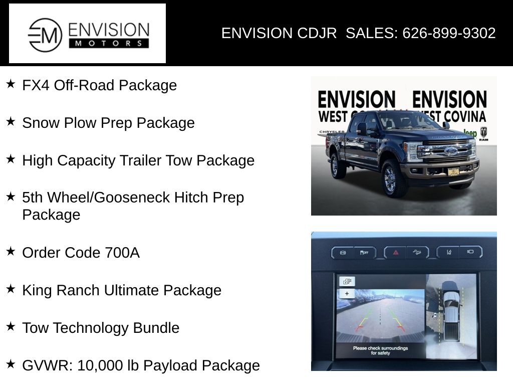 WE SPECIALIZE IN ALL CREDIT PROFILES! See what we can do for you! Call to find out (626) 899-9302.Clean CARFAX.4WD, 5th Wheel/Gooseneck Hitch Prep Package, FX4 Off-Road Package, GVWR: 10,000 lb Payload Package, High Capacity Trailer Tow Package, King Ranch Ultimate Package, Lane-Keeping Alert, Order Code 700A, Snow Plow Prep Package, Tow Technology Bundle, Twin Panel Power Moonroof.Brown2017 Ford F-250SD King Ranch 4WD TorqShift 6-Speed Automatic Power Stroke 6.7L V8 DI 32V OHV Turbodiesel**********All Pricing and Advertised Prices for any/all vehicles offered for sale does not include dealer installed accessories which can be purchased for an additional cost.********** The Factory Rebates may not be available on this vehicle if you elect to take advantage of a Special Alternative APR or Special Lease program. Some Factory Rebates are California Resident specific and may vary for residents of other states. NO sales to Dealers, Brokers or Exporters. For out of state purchase, customers must be present to purchase. If shipping is required, dealership must facilitate; no exceptions. Please contact us for special Multi-Vehicle or Fleet pricing. Prices are plus government fees and taxes, any finance charges, $85 documentary fee, $29 electronic registration fee, any emission testing charge and $1.75 per new tire state tire fee. *** We make every effort to provide accurate information, but please verify before purchasing. Leasing & financing available on approved credit. Trade-ins accepted. Subject to prior sale.Awards: * 2017 KBB.com 10 Most Awarded Brands * 2017 KBB.com Brand Image AwardsReviews: * Power Stroke turbodiesel V8 generates immense power and torque; stronger frame and suspension enable increased payload and tow ratings; aluminum body reduces overall weight and improves efficiency; spacious new cabs offer many convenience and technology options. Source: Edmunds