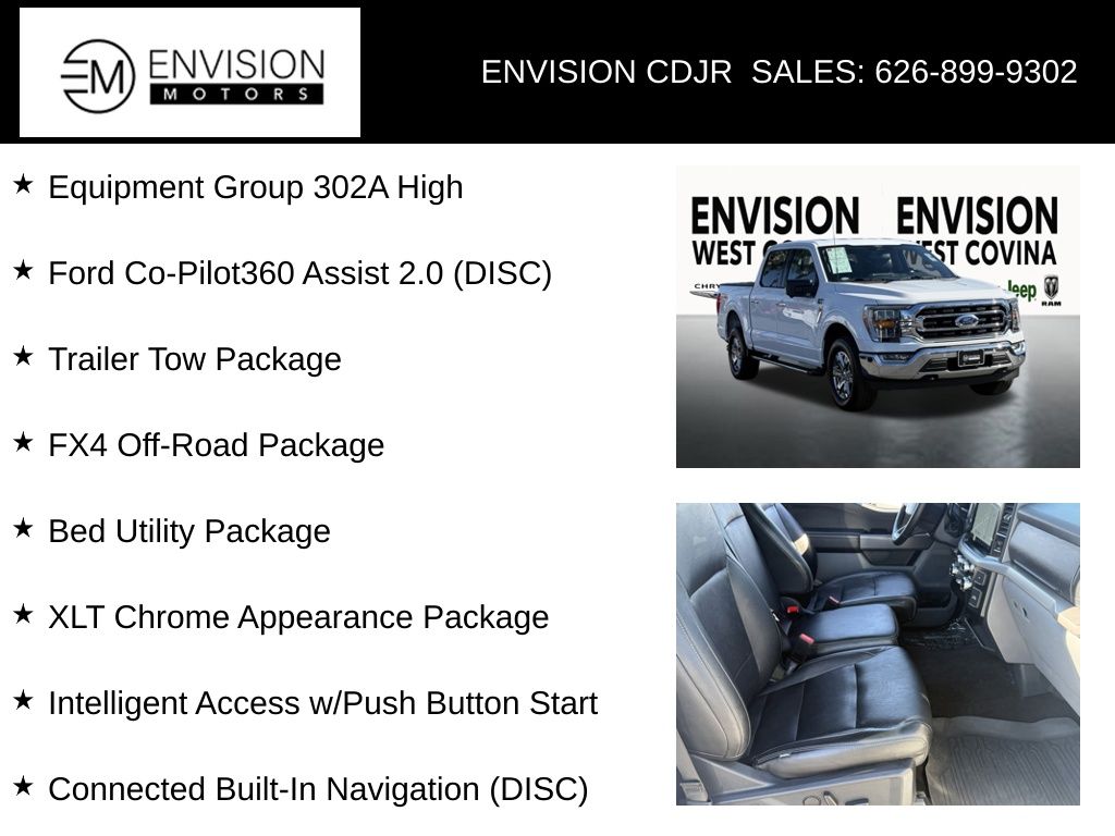 WE SPECIALIZE IN ALL CREDIT PROFILES! See what we can do for you! Call to find out (626) 899-9302.Odometer is 34171 miles below market average! 4WD, 8" Productivity Screen in Instrument Cluster, Bed Utility Package, Connected Built-In Navigation (DISC), Equipment Group 302A High, Evasive Steering Assist, Ford Co-Pilot360 Assist 2.0 (DISC), FX4 Off-Road Package, Heated Front Seats, Intelligent Access w/Push Button Start, Trailer Tow Package, XLT Chrome Appearance Package.Oxford White2022 Ford F-150 XLT 4WD 10-Speed Automatic 3.5L V6 EcoBoost**********All Pricing and Advertised Prices for any/all vehicles offered for sale does not include dealer installed accessories which can be purchased for an additional cost.********** The Factory Rebates may not be available on this vehicle if you elect to take advantage of a Special Alternative APR or Special Lease program. Some Factory Rebates are California Resident specific and may vary for residents of other states. NO sales to Dealers, Brokers or Exporters. For out of state purchase, customers must be present to purchase. If shipping is required, dealership must facilitate; no exceptions. Please contact us for special Multi-Vehicle or Fleet pricing. Prices are plus government fees and taxes, any finance charges, $85 documentary fee, $29 electronic registration fee, any emission testing charge and $1.75 per new tire state tire fee. *** We make every effort to provide accurate information, but please verify before purchasing. Leasing & financing available on approved credit. Trade-ins accepted. Subject to prior sale.