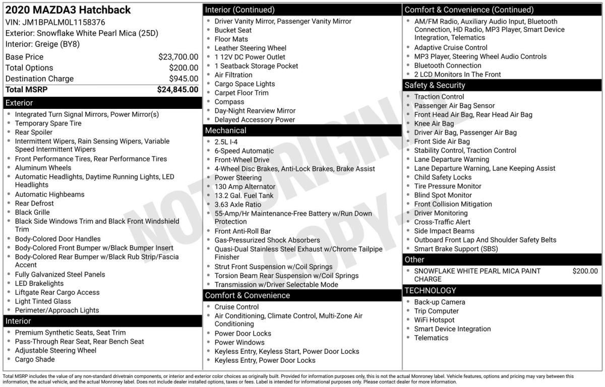 Experience the perfect blend of style, performance, and technology in this exceptional 2020 Mazda Mazda3 Base. With its sleek exterior, refined interior, and impressive capabilities, this vehicle is the embodiment of Mazda's commitment to craftsmanship and innovation.Elevate your driving experience with the following standout features:- Snowflake White Pearl Mica Paint Charge- Remote keyless entry- Brake assist- AppLink/Apple CarPlay and Android AutoStep inside and be captivated by the Mazda3's thoughtfully designed cabin, featuring premium leatherette seating, a user-friendly infotainment system, and a host of advanced safety technologies. The 8-speaker audio system and automatic climate control ensure your comfort and convenience on every journey.Beneath the hood, the Mazda3's 2.0-liter I4 engine delivers an exceptional balance of power and efficiency, with an impressive EPA-estimated 26 city/35 highway MPG. The 6-speed automatic transmission and front-wheel-drive configuration provide a smooth and responsive driving experience, making this vehicle a joy to pilot through city streets and open highways alike.Safety is paramount, and the Mazda3 delivers with features like dual front impact airbags, dual front side impact airbags, electronic stability control, and an Exterior Parking Camera Rear. These advanced systems work together to provide you and your loved ones with the confidence and protection you deserve.Whether you're commuting to the office, embarking on a weekend getaway, or simply enjoying the thrill of the open road, this 2020 Mazda Mazda3 Base is the perfect companion. Experience the difference that Mazda's dedication to craftsmanship and innovation can make in your daily driving.We invite you to visit our showroom and take this exceptional vehicle for a test drive. Discover the Mazda3 difference and let us help you find the perfect car to elevate your driving experience.