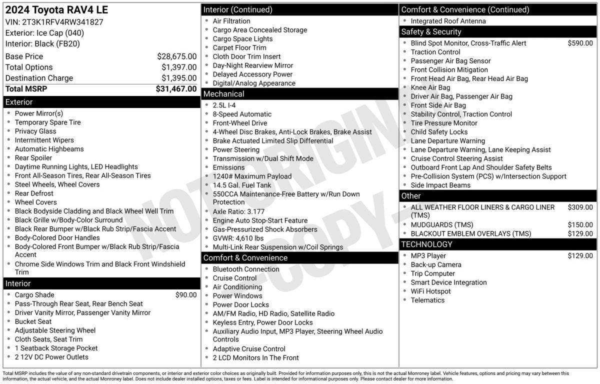 Discover the perfect balance of style, capability, and efficiency in the 2024 Toyota RAV4 LE. This versatile SUV is designed to elevate your driving experience, offering a seamless blend of modern technology, exceptional comfort, and uncompromising performance.- BLACKOUT EMBLEM OVERLAYS (TMS)- BLIND SPOT MONITOR W/RCTA- MUDGUARDS (TMS)- REAR DUAL USB POWER PORT CHARGER (TMS)- REAR CARGO AREA COVERPowered by a 2.5L 4-Cylinder DOHC Dual VVT-i engine paired with an 8-Speed Automatic transmission, this RAV4 LE delivers an impressive 27 MPG in the city and 35 MPG on the highway, ensuring exceptional fuel efficiency without sacrificing driving dynamics.Slip into the driver's seat and experience the refined interior, featuring a host of advanced features that cater to your every need. Enjoy the convenience of hands-free connectivity, the safety of Blind Spot Monitoring, and the versatility of a split-folding rear seat. With ample cargo space and a sleek, modern design, the RAV4 LE is the perfect companion for your adventures, whether you're commuting to the office or embarking on a weekend getaway.Backed by Toyota's renowned reputation for quality and reliability, this RAV4 LE is a testament to the brand's commitment to excellence. With its impressive array of standard features and thoughtful design, this SUV is poised to exceed your expectations and provide you with a driving experience that is truly second to none.We invite you to visit our showroom and experience the 2024 Toyota RAV4 LE for yourself. Discover the perfect blend of style, capability, and efficiency that will elevate your driving experience and leave a lasting impression. Contact us today to schedule a test drive and unlock the full potential of this remarkable SUV.