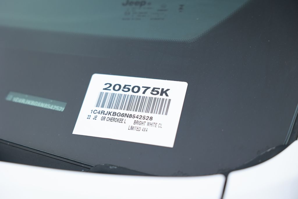 The Price you See is the Price you pay !!! No Games no Forced extrasThis 2022 Jeep Grand Cherokee L Limited is a commanding presence on the road, blending rugged capability with refined luxury. Boasting a powerful 3.6L V6 engine mated to an 8-speed automatic transmission, this 4WD SUV delivers an impressive balance of performance and efficiency, with a city rating of 18 MPG and a highway rating of 25 MPG.- 2ND ROW 60/40 BENCH W/MANUAL TIP/SLIDE- RADIO: UCONNECT 5 NAV W/10.1" DISPLAY- 10.1" Touchscreen Display- 9 Amplified Speakers w/Subwoofer- GPS Navigation- Connected Travel & Traffic ServicesSlip into the plush Capri leather-trimmed seats and experience the comfort and convenience of this well-appointed Grand Cherokee L. The spacious interior offers seating for up to 7 passengers, with a versatile 60/40 split-folding second-row bench and a power liftgate for easy cargo access.The Uconnect 5 infotainment system with a massive 10.1-inch touchscreen display puts a world of connectivity at your fingertips. Enjoy seamless integration with Apple CarPlay and Google Android Auto, as well as a premium 506-watt amplifier and 9 speakers for an immersive audio experience.Safety and technology work hand-in-hand, with features like the ParkView Rear Back-Up Camera, Adaptive Cruise Control, and a suite of advanced airbags to help keep you and your loved ones secure. The Grand Cherokee L also boasts an impressive array of driver-assist technologies, including Automatic Emergency Braking, Lane Departure Warning, and Blind Spot Monitoring, providing you with added peace of mind on the road.Whether you're embarking on a family adventure or seeking a luxurious daily driver, this 2022 Jeep Grand Cherokee L Limited is poised to exceed your expectations. Experience the perfect blend of capability, comfort, and cutting-edge technology. Visit our showroom today and let us demonstrate why this exceptional SUV should be your next vehicle.