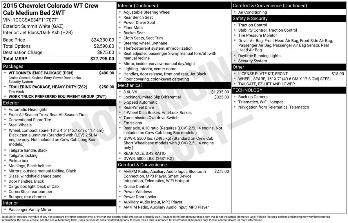Experience the perfect blend of power, efficiency, and versatility with this 2015 Chevrolet Colorado Work Truck. This rugged and capable pickup is ready to take on any task, whether it's hauling heavy loads or navigating the toughest terrain.- 3.6L V6 DGI DOHC VVT engine with 6-speed automatic transmission- Rear-wheel drive for optimal traction and control- 18 city/26 highway MPG for impressive fuel economy- Cloth seat trim and power driver's seat for comfortable drivingThis Colorado Work Truck is equipped with a range of features that make it a true workhorse:- 6-speaker audio system with AM/FM radio and 4.2" color display- Air conditioning and power windows for your comfort- Electronic stability control and traction control for enhanced safety- Rear parking camera for easy maneuveringThe exterior of this Colorado is finished in a sleek White color, complemented by body-color bumpers and a rear step bumper for easy access. The 16" steel wheels provide a rugged and dependable look.Inside, you'll find a well-appointed cabin with a tilt steering wheel, trip computer, and power steering for a smooth and responsive driving experience. The front bucket seats with a center armrest offer ample support and comfort, while the rear seat center armrest provides additional convenience.This 2015 Chevrolet Colorado Work Truck is the perfect blend of capability, efficiency, and comfort. With its impressive features and reliable performance, it's the ideal choice for those who demand a hardworking and versatile pickup. Visit our showroom today to experience this remarkable vehicle for yourself and see how it can transform your driving experience.