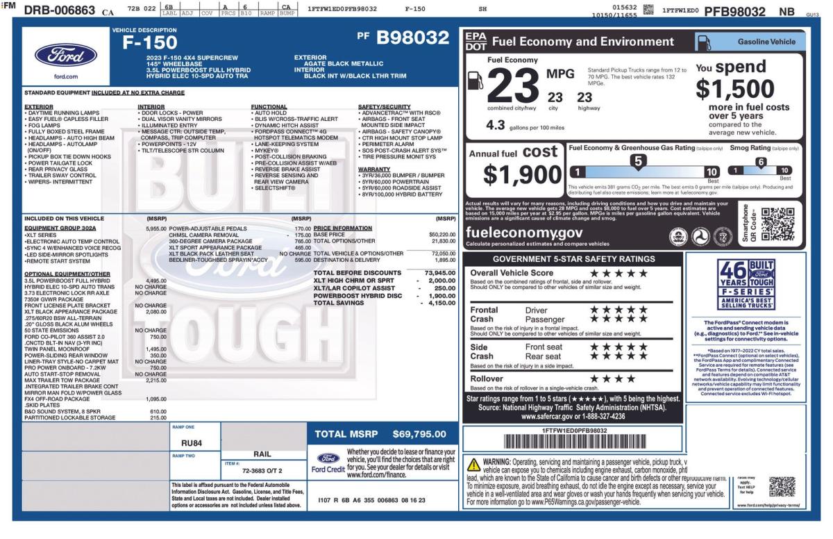 Discover the ultimate combination of power, capability, and technology in this exceptional 2023 Ford F-150 XLT. With its impressive 3.5L PowerBoost Full-Hybrid V6 engine, 10-speed automatic transmission, and 4-wheel drive, this truck is ready to tackle any task with confidence. - XLT BLACK APPEARANCE PACKAGE- EQUIPMENT GROUP 302A HIGH- POWER-SLIDING REAR WINDOW- FORD CO-PILOT360 ASSIST 2.0- TWIN PANEL MOONROOF- PRO POWER ONBOARD - 7.2KW- TRAY STYLE FLOOR LINER (47W)- MAX TRAILER TOW PACKAGE- FX4 OFF-ROAD PACKAGE- RADIO: B&O SOUND SYSTEM BY BANG & OLUFSEN- PARTITIONED LOCKABLE FOLD-FLAT STORAGE- POWER-ADJUSTABLE PEDALS- 360 DEGREE CAMERA- XLT SPORT APPEARANCE PACKAGE- TOUGH BED SPRAY-IN BEDLINERThis F-150 XLT is equipped with a host of premium features that elevate the driving experience. The Ford Co-Pilot360 Assist 2.0 system provides advanced safety and driver-assist technologies, including Intelligent Adaptive Cruise Control, Lane Centering, and Intersection Assist. The twin-panel moonroof and Pro Power Onboard 7.2kW system add versatility and convenience, while the FX4 Off-Road Package ensures you're ready to tackle any terrain.The XLT Sport Appearance Package enhances the exterior with stylish touches like body-color bumpers, a black grille, and unique interior finishes. The Tough Bed spray-in bedliner and Class IV trailer hitch receiver with integrated brake controller make this truck a true workhorse, ready to handle your toughest jobs.Step inside and you'll be greeted by the SYNC 4 infotainment system, which offers seamless smartphone integration, voice-activated controls, and a high-resolution 12-inch touchscreen. The 10-way power-adjustable front seats and dual-zone automatic climate control ensure your comfort, while the 8-inch productivity screen in the instrument cluster keeps you informed and in control.Whether you're hauling heavy loads, towing a trailer, or simply enjoying the open road, this 2023 Ford F-150 XLT is the perfect companion. Experience the perfect blend of power, capability, and technology by visiting our showroom today. We're confident you'll be impressed by this exceptional truck and its unparalleled value.
