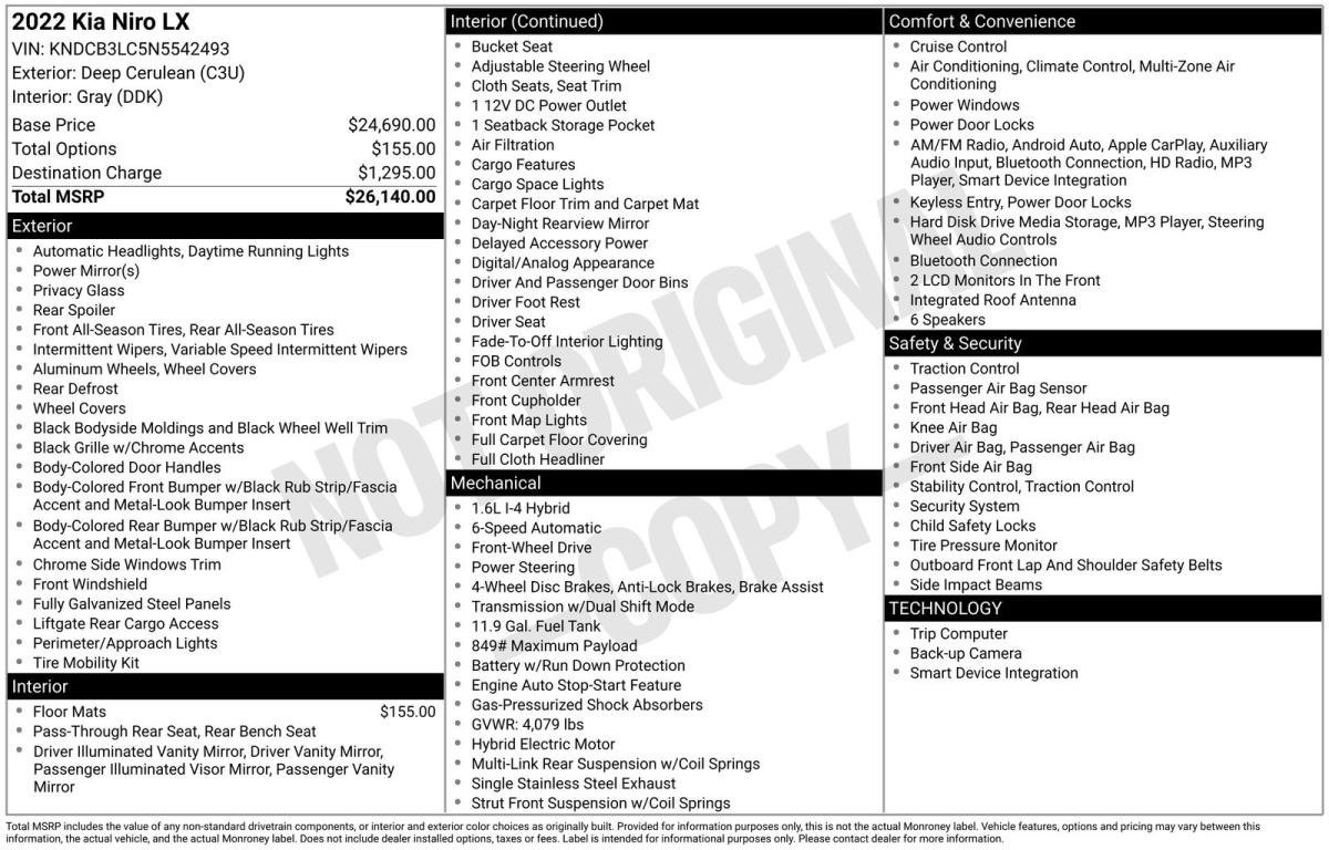 The 2022 Kia Niro LX is a smart, efficient, and versatile crossover designed for drivers who want exceptional fuel economy without sacrificing comfort or practicality. With its advanced hybrid powertrain combining a 1.6L 4-cylinder engine and electric motor, this Niro delivers outstanding efficiencyachieving an impressive 53 MPG in the citymaking it a standout choice for commuters and eco-conscious drivers alike.What sets this Niro LX apart from the competition is its seamless blend of hybrid performance and everyday usability. The 6-speed dual-clutch automatic transmission provides a more engaging and responsive driving experience compared to traditional CVTs found in many hybrids, while maintaining smooth and efficient power delivery. Its front-wheel-drive layout and well-tuned suspension offer a comfortable, composed ride whether you're navigating city streets or longer highway drives.Inside, the Niro offers a thoughtfully designed cabin focused on comfort and convenience. Dual-zone automatic climate control, a spacious seating layout with 60/40 split-folding rear seats, and a user-friendly driver information center make it ideal for both daily use and weekend getaways. High-quality materials with piano black and metal-look accents give the interior a refined feel that exceeds expectations in this segment.Safety is another area where this Niro shines. Equipped with a strong suite of standard features including a rearview camera, multiple airbags, stability and traction control systems, and advanced braking technology with regenerative braking, it delivers confidence and peace of mind on every drive.On the exterior, the Niro features clean, modern styling with practical touches like roof rails, alloy wheels, and a sleek aerodynamic design that not only looks good but also enhances efficiency. Its compact crossover footprint makes it easy to maneuver while still offering excellent cargo space and versatility.Additional highlights include selectable drive modes for optimized efficiency or performance, regenerative braking to maximize energy recovery, and a well-balanced chassis that prioritizes comfort and control. Altogether, this 2022 Kia Niro LX stands out as a highly efficient, well-equipped hybrid crossover that delivers exceptional value and everyday practicality in a modern, eco-friendly package.