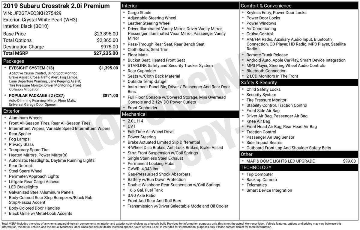 The 2019 Subaru Crosstrek 2.0i Premium is the perfect combination of versatility, safety, and all-weather capability making it a standout choice for drivers who want confidence on any road, in any season.Powered by a reliable 2.0L 4-cylinder engine paired with a smooth Lineartronic CVT, this Crosstrek delivers impressive fuel efficiency while maintaining the capability Subaru is known for. Its legendary Symmetrical All-Wheel Drive system comes standard, giving you enhanced traction and control whether you're navigating rain, snow, or off-the-beaten-path adventures.What truly sets this Crosstrek apart is its highly desirable EyeSight Driver Assist Technology, included as part of the Popular Package #2. This advanced safety suite features adaptive cruise control, pre-collision braking, lane departure warning, and more bringing peace of mind that rivals many newer vehicles.This well-equipped Premium model also includes a strong list of upgraded features designed for comfort, convenience, and year-round usability:Blind Spot Detection with Rear Cross-Traffic AlertHeated front seats for cold-weather comfortAll-weather floor liners and rear bumper cover for added protectionPower features including heated mirrors and remote keyless entryAuto-dimming mirror with HomeLink for added convenienceRear seatback protector and splash guards for active lifestylesInside, the Crosstrek offers a refined yet durable interior with unique black cloth upholstery accented by orange stitching, along with a leather-wrapped steering wheel and intuitive controls. The Subaru STARLINK 6.5-inch multimedia system with Apple CarPlay and Android Auto keeps you seamlessly connected on the go.On the exterior, rugged styling meets practicality with 17-inch alloy wheels, raised ground clearance, roof rails for added cargo capability, and distinctive Subaru design cues that emphasize its adventurous spirit.Additional highlights include:X-MODE with Hill Descent Control for enhanced off-road confidenceRearview camera and tire pressure monitoring systemSteering-responsive fog lights for improved visibilitySpacious cargo area with flexible storage solutionsWith its combination of advanced safety technology, proven AWD capability, and thoughtful upgrades, this 2019 Subaru Crosstrek 2.0i Premium stands out as a smart, adventure-ready crossover that's built to handle whatever your lifestyle demands.